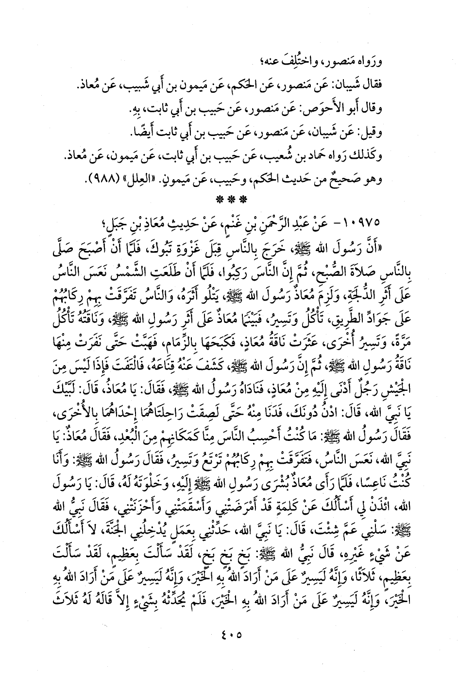 «أن رسول الله صَلى الله عَليه وسَلم خرج بالناس قبل غزوة تبوك، فلما أن أصبح صلى بالناس صلاة الصبح، ثم إن الناس ركبوا، فلما أن طلعت الشمس نعس الناس على أثر الدلجة، ولزم معاذ رسول الله صَلى الله عَليه وسَلم يتلو أثره، والناس تفرقت بهم ركابهم على جواد الطريق، تأكل وتسير، فبينما معاذ على أثر رسول الله صَلى الله عَليه وسَلم وناقته تأكل مرة، وتسير أخرى، عثرت ناقة معاذ، فكبحها بالزمام، فهبت حتى نفرت منها ناقة رسول الله صَلى الله عَليه وسَلم ثم إن رسول الله صَلى الله عَليه وسَلم كشف عنه قناعه، فالتفت فإذا ليس من الجيش رجل أدنى إليه من معاذ، فناداه رسول الله صَلى الله عَليه وسَلم فقال: يا معاذ، قال: لبيك يا نبي الله، قال: ادن دونك، فدنا منه حتى لصقت راحلتاهما إحداهما بالأخرى، فقال رسول الله صَلى الله عَليه وسَلم: ما كنت أحسب الناس منا كمكانهم من البعد، فقال معاذ: يا نبي الله، نعس الناس، فتفرقت بهم ركابهم ترتع وتسير، فقال رسول الله صَلى الله عَليه وسَلم: وأنا كنت ناعسا، فلما رأى معاذ بشرى رسول الله صَلى الله عَليه وسَلم إليه، وخلوته له، قال: يا رسول الله، ائذن لي أسألك عن كلمة قد أمرضتني وأسقمتني وأحزنتني، فقال نبي الله صَلى الله عَليه وسَلم: سلني عم شئت، قال: يا نبي الله، حدثني بعمل يدخلني الجنة، لا أسألك عن شيء غيره، قال نبي الله صَلى الله عَليه وسَلم: بخ بخ بخ، لقد سألت بعظيم، لقد سألت بعظيم، ثلاثا، وإنه ليسير على من أراد الله به الخير، وإنه ليسير على من أراد الله به الخير، وإنه ليسير على من أراد الله به الخير، فلم يحدثه بشيء إلا قاله له ثلاث