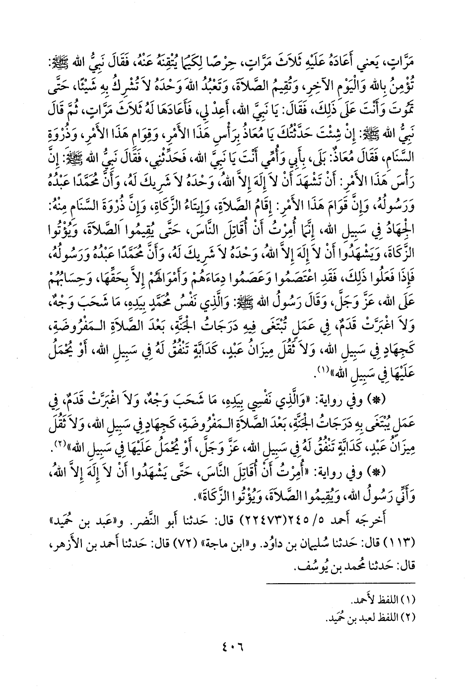 ثم قال نبي الله صَلى الله عَليه وسَلم: إن شئت حدثتك يا معاذ برأس هذا الأمر، وقوام هذا الأمر، وذروة السنام، فقال معاذ: بلى، بأبي وأمي أنت يا نبي الله، فحدثني، فقال نبي الله صَلى الله عَليه وسَلم: إن رأس هذا الأمر: أن تشهد أن لا إله إلا الله، وحده لا شريك له، وأن محمدا عبده ورسوله، وإن قوام هذا الأمر: إقام الصلاة، وإيتاء الزكاة، وإن ذروة السنام منه: الجهاد في سبيل الله، إنما أمرت أن أقاتل الناس، حتى يقيموا الصلاة، ويؤتوا الزكاة، ويشهدوا أن لا إله إلا الله، وحده لا شريك له، وأن محمدا عبده ورسوله، فإذا فعلوا ذلك، فقد اعتصموا وعصموا دماءهم وأموالهم إلا بحقها، وحسابهم على الله، عز وجل، وقال رسول الله صَلى الله عَليه وسَلم: والذي نفس محمد بيده، ما شحب وجه، ولا اغبرت قدم، في عمل تبتغى فيه درجات الجنة، بعد الصلاة المفروضة، كجهاد في سبيل الله، ولا ثقل ميزان عبد، كدابة تنفق له في سبيل الله، أو يحمل عليها في سبيل الله» (¬١).