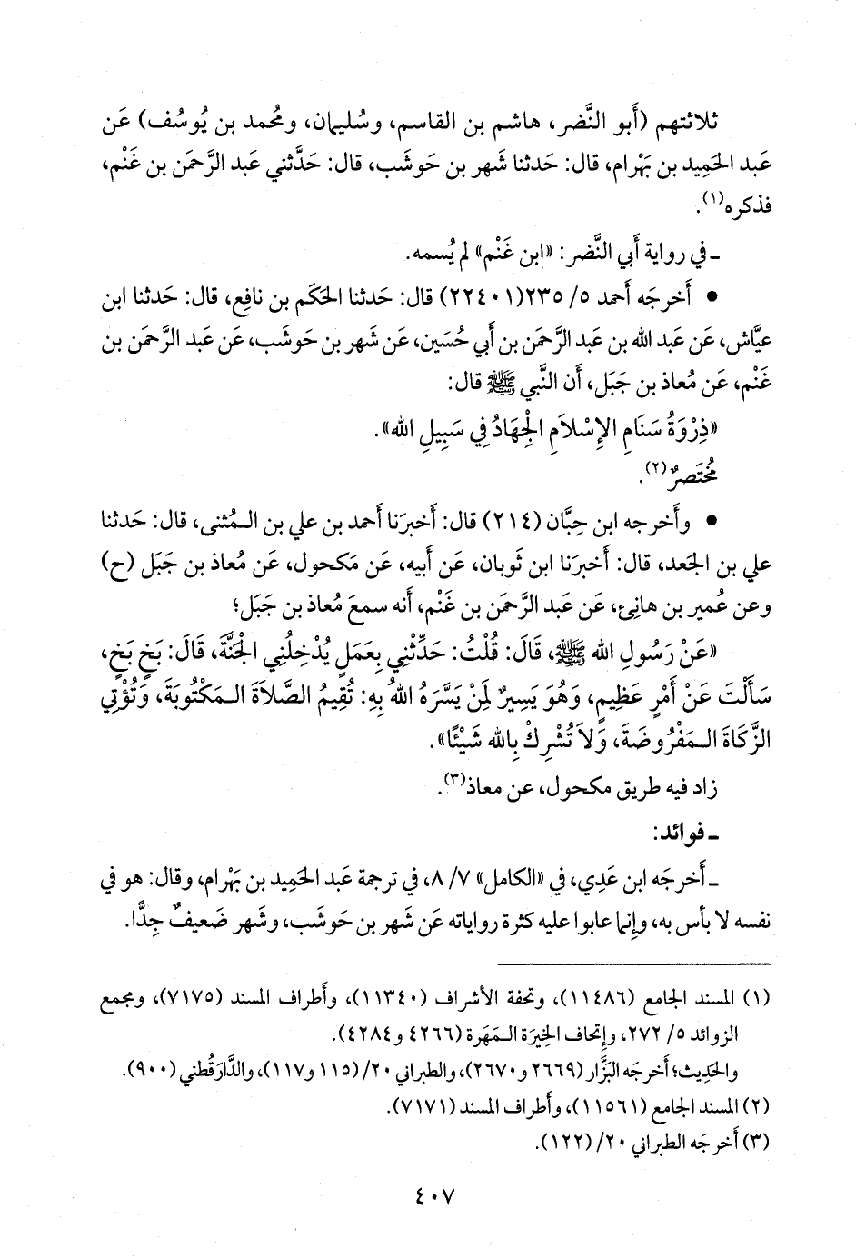 • أَخرجه أحمد (٢٢٤٠١) قال: حدثنا الحكم بن نافع، قال: حدثنا ابن عياش، عن عبد الله بن عبد الرَّحمَن بن أبي حسين، عن شهر بن حوشب، عن عبد الرَّحمَن بن غَنْم، عن معاذ بن جبل، أن النبي صَلى الله عَليه وسَلم قال: