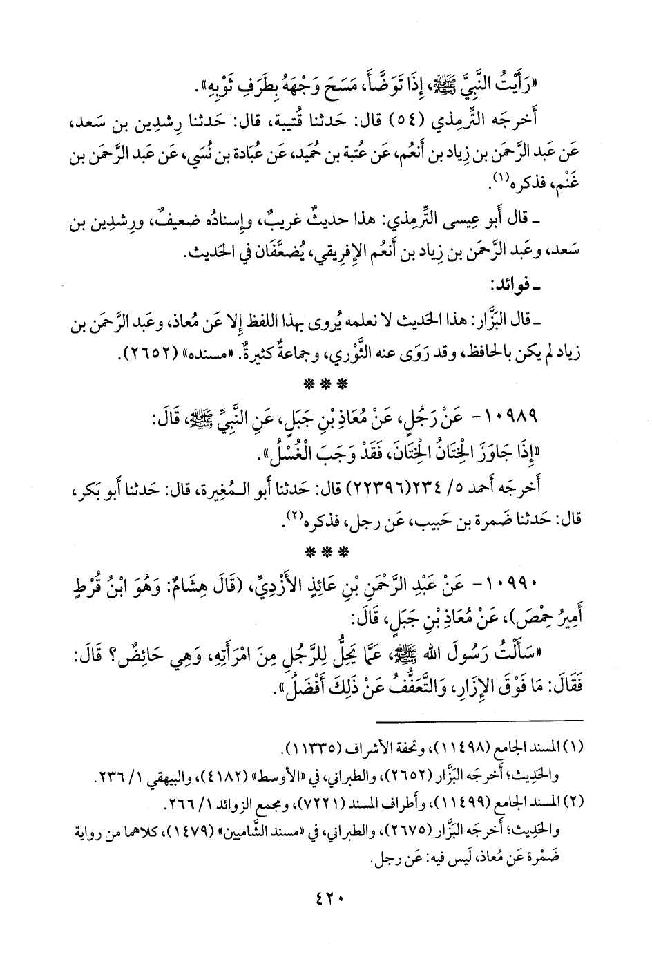 - وقال البزار: هذا الحديث لا نعلمه يروى بهذا اللفظ إلا عن معاذ، وعبد الرَّحمَن بن زياد لم يكن بالحافظ، وقد روى عنه الثوري، وجماعة كثيرة. «مسنده» (٢٦٥٢).