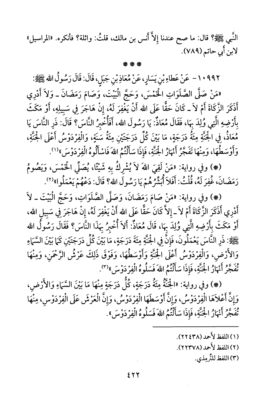 «من صلى الصلوات الخمس، وحج البيت، وصام رمضان، ولا أدري أذكر الزكاة أم لا ـ كان حقا على الله أن يغفر له، إن هاجر في سبيله، أو مكث بأرضه التي ولد بها، فقال معاذ: يا رسول الله، أفأخبر الناس؟ قال: ذر الناس يا معاذ، في الجنة مئة درجة، ما بين كل درجتين مئة سنة، والفردوس أعلى الجنة، وأوسطها، ومنها تفجر أنهار الجنة، فإذا سألتم الله فاسألوه الفردوس» (¬١).