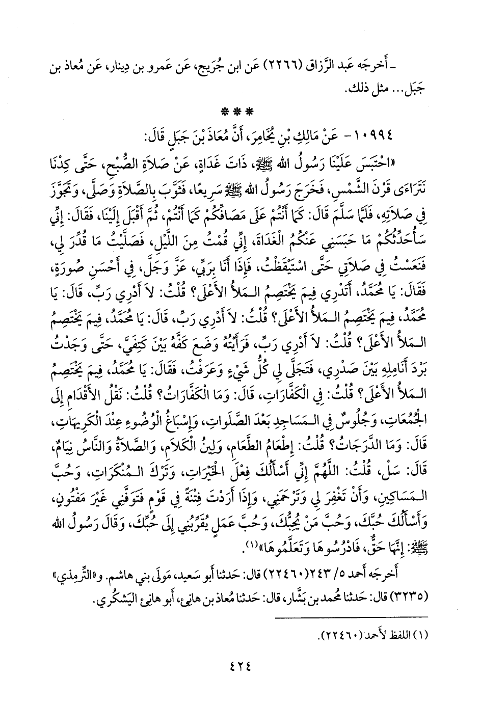 «احتبس علينا رسول الله صَلى الله عَليه وسَلم ذات غداة، عن صلاة الصبح، حتى كدنا نتراءى قرن الشمس، فخرج رسول الله صَلى الله عَليه وسَلم سريعا، فثوب بالصلاة وصلى، وتجوز في صلاته، فلما سلم قال: كما أنتم على مصافكم كما أنتم، ثم أقبل إلينا، فقال: إني سأحدثكم ما حبسني عنكم الغداة، إني قمت من الليل، فصليت ما قدر لي، فنعست في صلاتي حتى استيقظت، فإذا أنا بربي، عز وجل، في أحسن صورة، فقال: يا محمد، أتدري فيم يختصم الملأ الأعلى؟ قلت: لا أدري رب، قال: يا محمد، فيم يختصم الملأ الأعلى؟ قلت: لا أدري رب، قال: يا محمد، فيم يختصم الملأ الأعلى؟ قلت: لا أدري رب، فرأيته وضع كفه بين كتفي، حتى وجدت برد أنامله بين صدري، فتجلى لي كل شيء وعرفت، فقال: يا محمد، فيم يختصم الملأ الأعلى؟ قلت: في الكفارات، قال: وما الكفارات؟ قلت: نقل الأقدام إلى الجمعات، وجلوس في المساجد بعد الصلوات، وإسباغ الوضوء عند الكريهات، قال: وما الدرجات؟ قلت: إطعام الطعام، ولين الكلام، والصلاة والناس نيام، قال: سل، قلت: اللهم إني أسألك فعل الخيرات، وترك المنكرات، وحب المساكين، وأن تغفر لي وترحمني، وإذا أردت فتنة في قوم فتوفني غير مفتون، وأسألك حبك، وحب من يحبك، وحب عمل يقربني إلى حبك، وقال رسول الله صَلى الله عَليه وسَلم: إنها حق، فادرسوها وتعلموها» (¬١).