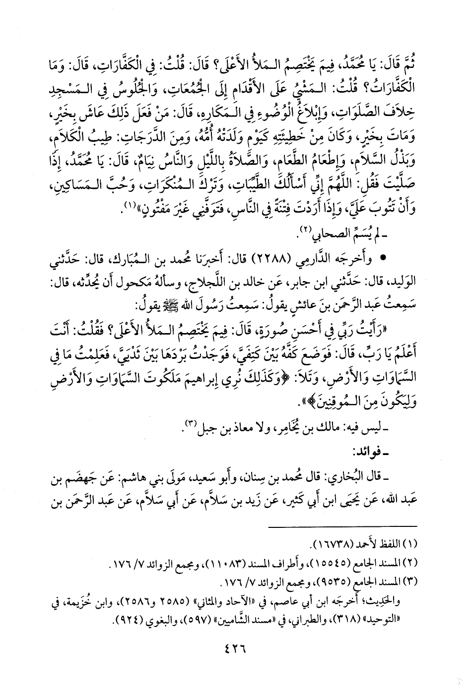 عائش، عن مالك بن يخامر، عن معاذ بن جبل، قال: قال النبي صَلى الله عَليه وسَلم: قيل لي: فيم يختصم الملأ الأعلى؟ قال: في الكفارات، قيل: وما الكفارات؟ قال: نقل الأقدام إلى الجمعات، وانتظار الصلاة بعد الصلاة.