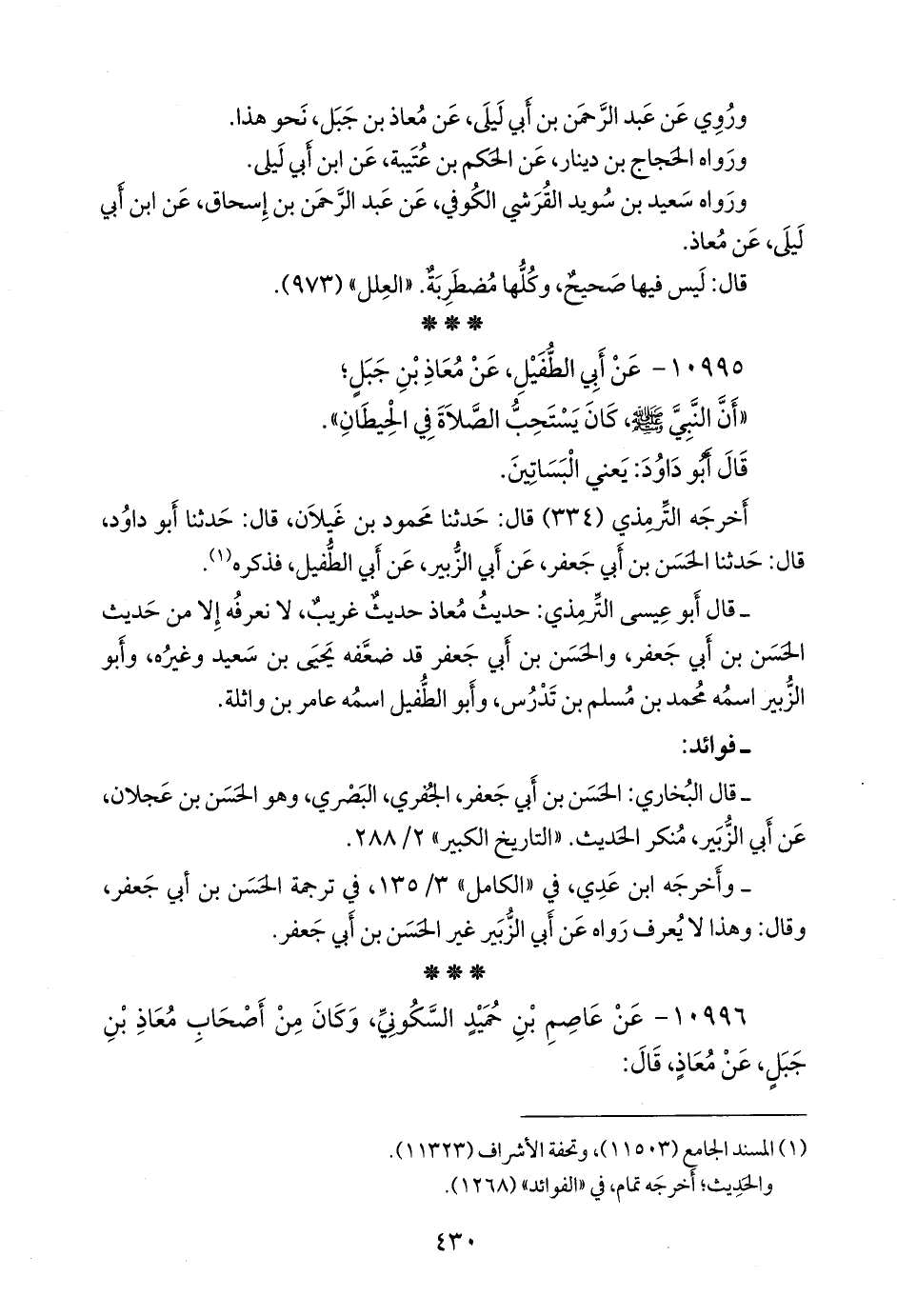 - قال التِّرمِذي: حديث معاذ حديث غريب، لا نعرفه إلا من حديث الحسن بن أبي جعفر، والحسن بن أبي جعفر قد ضعفه يحيى بن سعيد وغيره، وأَبو الزبير اسمه محمد بن مسلم بن تدرس، وأَبو الطفيل اسمه عامر بن واثلة.