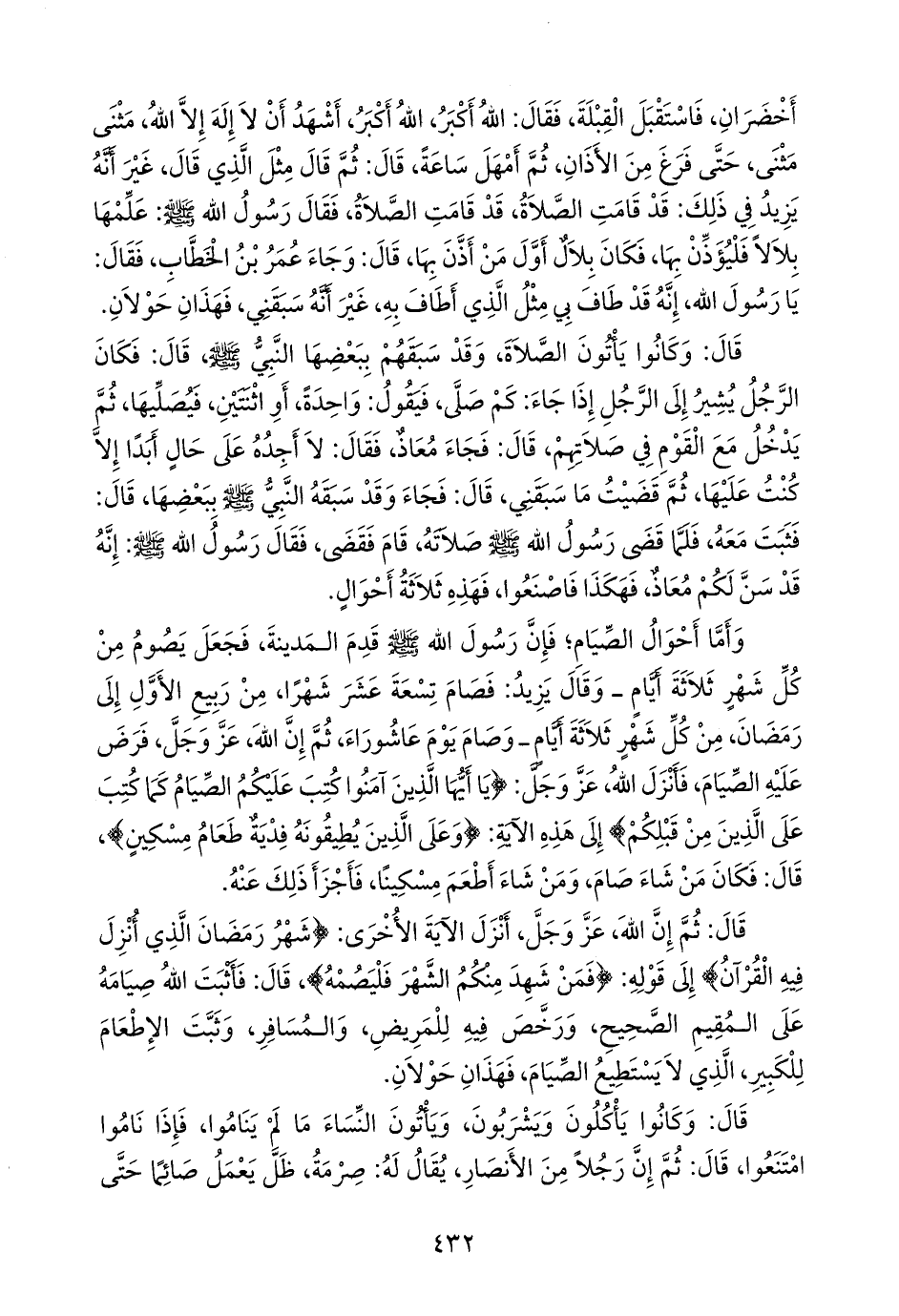 وأما أحوال الصيام؛ فإن رسول الله صَلى الله عَليه وسَلم قدم المدينة، فجعل يصوم من كل شهر ثلاثة أيام، وقال يزيد: فصام تسعة عشر شهرا، من ربيع الأول إلى رمضان، من كل شهر ثلاثة أيام، وصام يوم عاشوراء، ثم إن الله، عز وجل، فرض عليه الصيام، فأنزل الله، عز وجل: {يا أيها الذين آمنوا كتب عليكم الصيام كما كتب على الذين من قبلكم} إلى هذه الآية: {وعلى الذين يطيقونه فدية طعام مسكين}، قال: فكان من شاء صام، ومن شاء أطعم مسكينا، فأجزأ ذلك عنه.