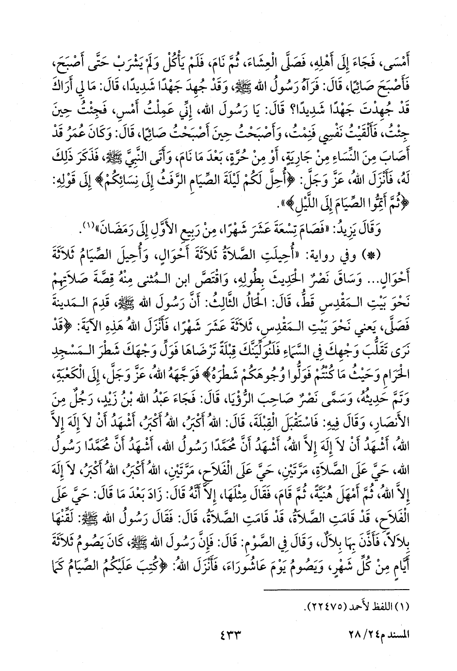- وفي رواية: «أحيلت الصلاة ثلاثة أحوال، وأحيل الصيام ثلاثة أحوال ... وساق نصر الحديث بطوله، واقتص ابن المثنى منه قصة صلاتهم نحو بيت المقدس قط، قال: الحال الثالث: أن رسول الله صَلى الله عَليه وسَلم قدم المدينة فصلى، يعني نحو بيت المقدس، ثلاثة عشر شهرا، فأنزل الله هذه الآية: {قد نرى تقلب وجهك في السماء فلنولينك قبلة ترضاها فول وجهك شطر المسجد الحرام وحيث ما كنتم فولوا وجوهكم شطره} فوجهه الله، عز وجل، إلى الكعبة، وتم حديثه، وسمى نصر صاحب الرؤيا، قال: فجاء عبد الله بن زيد، رجل من الأنصار، وقال فيه: فاستقبل القبلة، قال: الله أكبر، الله أكبر، أشهد أن لا إله إلا الله، أشهد أن لا إله إلا الله، أشهد أن محمدا رسول الله، أشهد أن محمدا رسول الله، حي على الصلاة، مرتين، حي على الفلاح، مرتين، الله أكبر، الله أكبر، لا إله إلا الله، ثم أمهل هنية، ثم قام، فقال مثلها، إلا أنه قال: زاد بعد ما قال: حي على الفلاح، قد قامت الصلاة، قد قامت الصلاة، قال: فقال رسول الله صَلى الله عَليه وسَلم: لقنها بلالا، فأذن بها بلال،