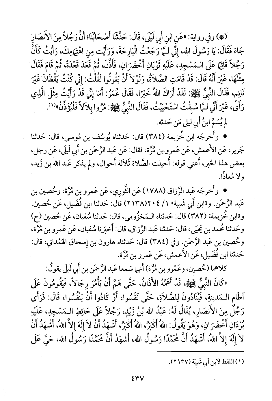 • وأخرجه ابن خزيمة (٣٨٤) قال: حدثناه يوسف بن موسى، قال: حدثنا جرير، عن الأعمش، عن عَمرو بن مُرَّة، فقال: عن عبد الرَّحمَن بن أبي ليلى، عن رجل، بعض هذا الخبر، أعني قوله: أحيلت الصلاة ثلاثة أحوال، ولم يذكر عبد الله بن زيد، ولا معاذا.