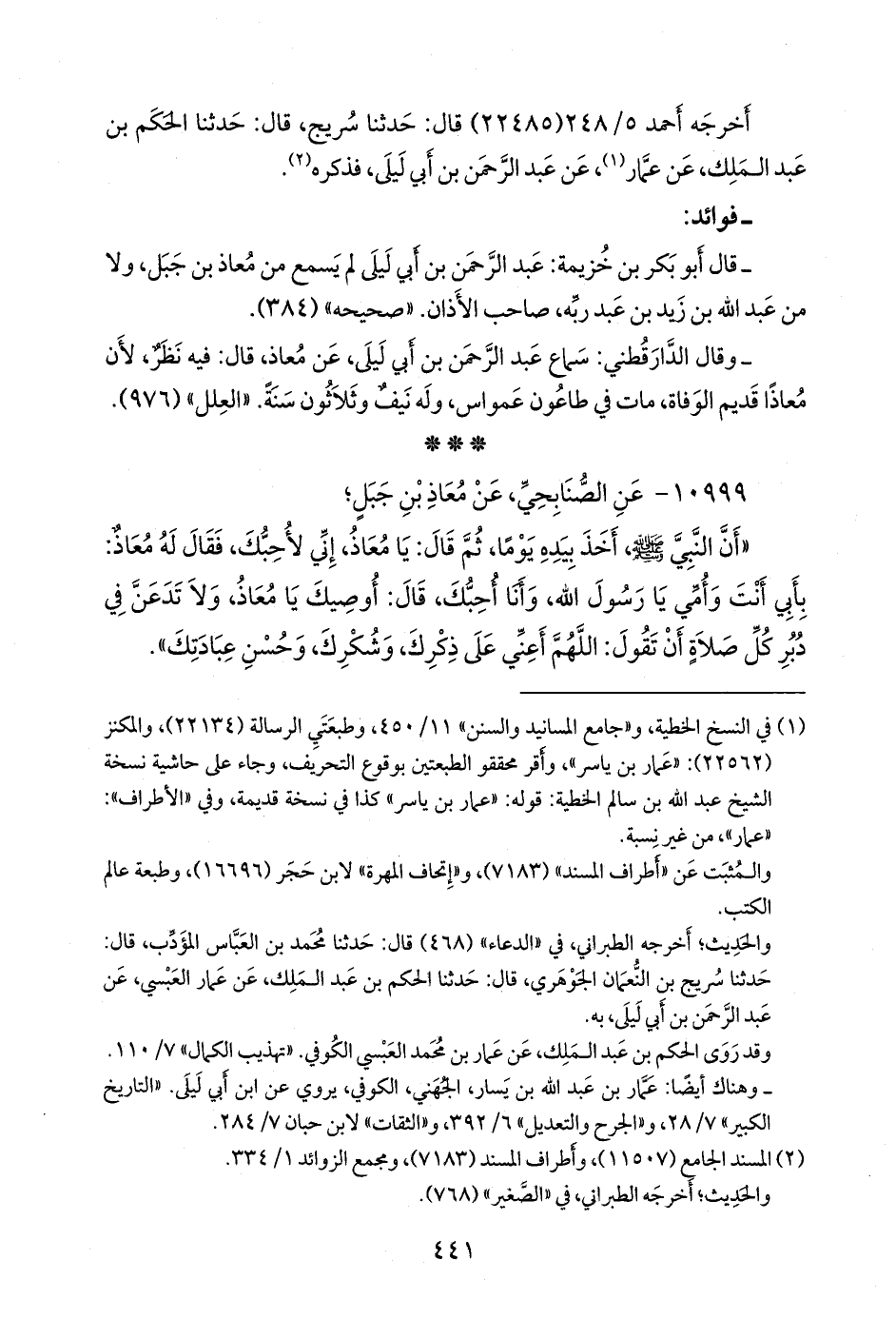 - وفي رواية: «أخذ بيدي رسول الله صَلى الله عَليه وسَلم فقال: إني لأحبك يا معاذ، فقلت: وأنا أحبك يا رسول الله، فقال رسول الله صَلى الله عَليه وسَلم: فلا تدع أن تقول في كل صلاة: رب أعني على ذكرك، وشكرك، وحسن عبادتك» (¬٣).