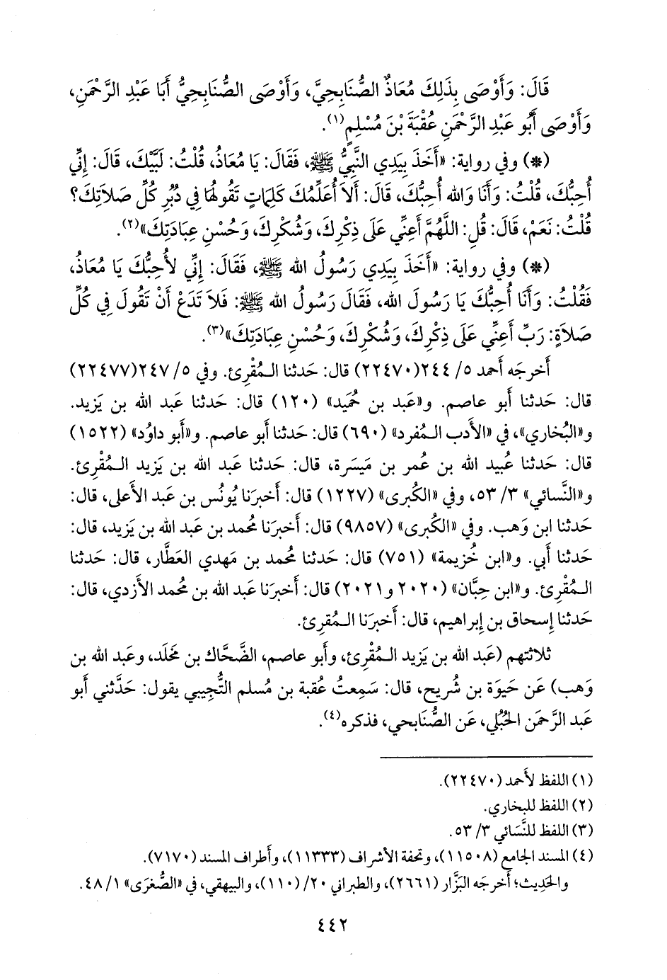 ثلاثتهم (عبد الله بن يزيد المُقرِئ، وأَبو عاصم الضحاك بن مخلد، وعبد الله بن وهب) عن حَيْوَة بن شُرَيح، قال: سمعت عقبة بن مسلم التجيبي يقول: حدثني أَبو عبد الرَّحمَن الحبلي، عن الصُّنَابحي، فذكره (¬١).