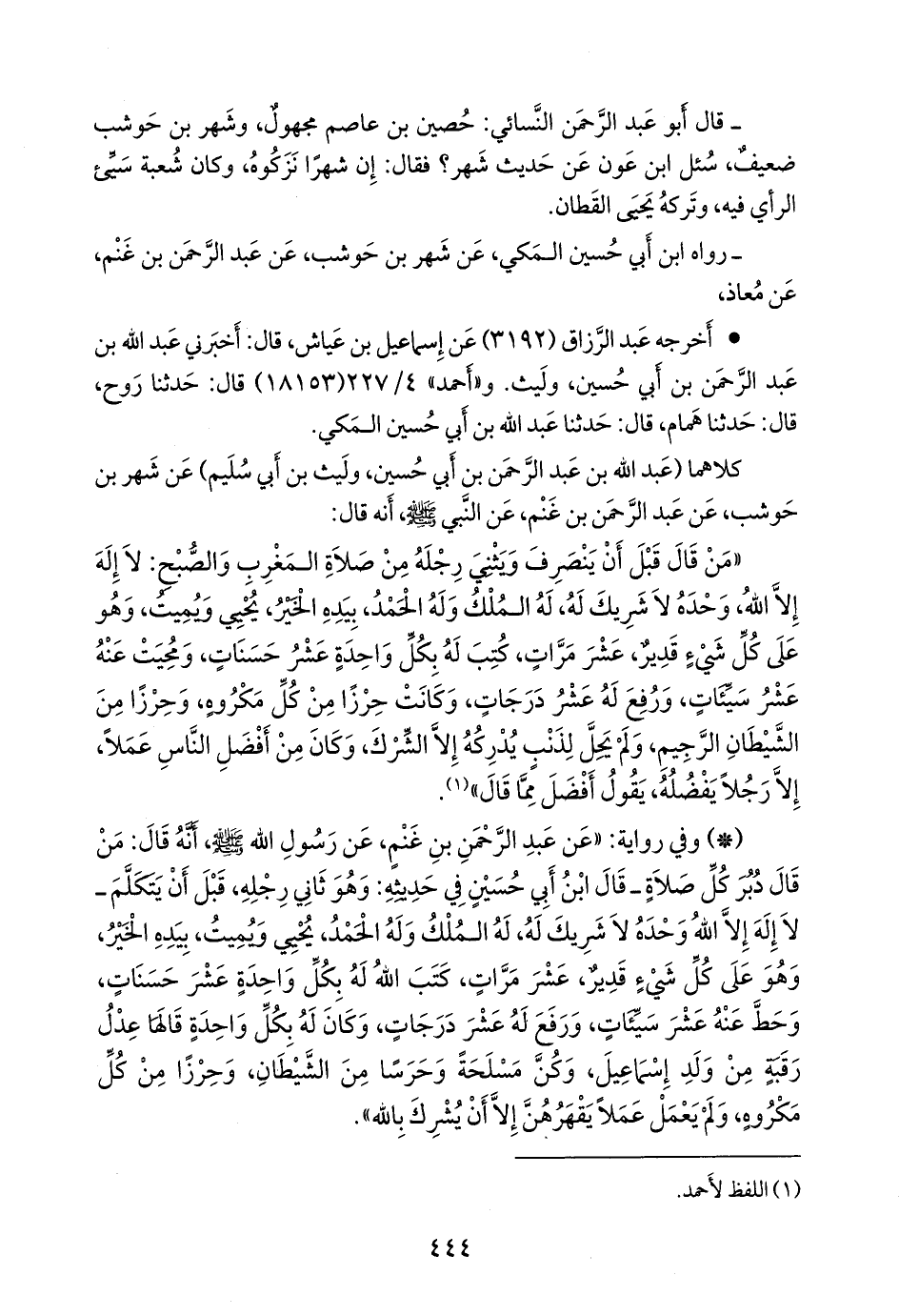 - وفي رواية: «عن عبد الرَّحمَن بن غَنْم، عن رسول الله صَلى الله عَليه وسَلم أنه قال: من قال دبر كل صلاة ـ قال ابن أبي حسين في حديثه: وهو ثاني رجله، قبل أن يتكلم ـ لا إله إلا الله وحده لا شريك له، له الملك وله الحمد، يحيي ويميت، بيده الخير، وهو على كل شيء قدير، عشر مرات، كتب الله له بكل واحدة عشر حسنات، وحط عنه عشر سيئات، ورفع له عشر درجات، وكان له بكل واحدة قالها عدل رقبة من ولد إسماعيل، وكن مسلحة وحرسا من الشيطان، وحرزا من كل مكروه، ولم يعمل عملا يقهرهن إلا أن يشرك بالله».