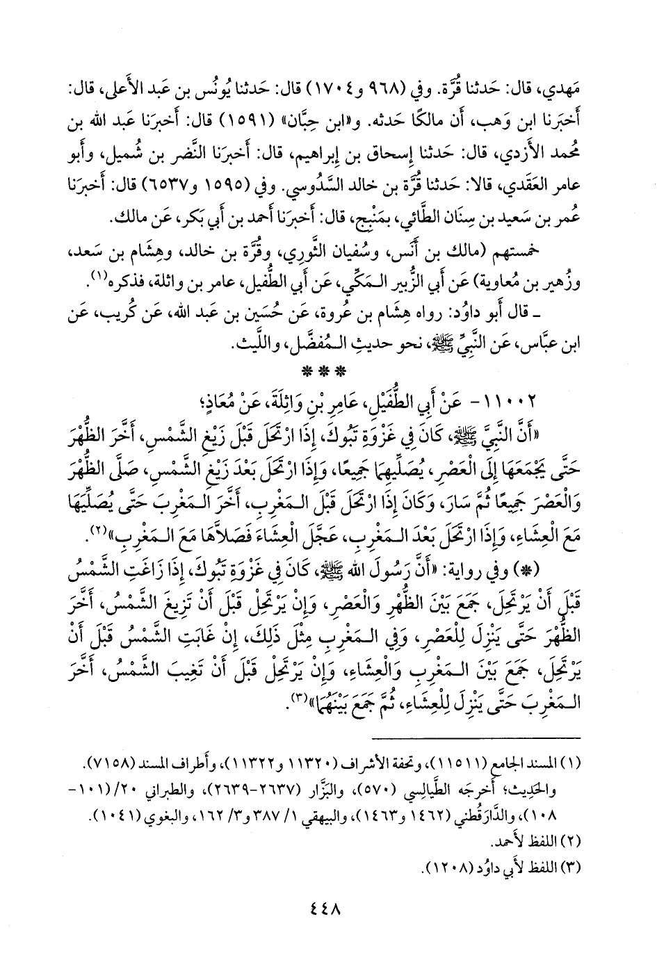 - وفي رواية: «أن رسول الله صَلى الله عَليه وسَلم كان في غزوة تبوك، إذا زاغت الشمس قبل أن يرتحل، جمع بين الظهر والعصر، وإن يرتحل قبل أن تزيغ الشمس، أخر الظهر حتى ينزل للعصر، وفي المغرب مثل ذلك، إن غابت الشمس قبل أن يرتحل، جمع بين المغرب والعشاء، وإن يرتحل قبل أن تغيب الشمس، أخر المغرب حتى ينزل للعشاء، ثم جمع بينهما» (¬٢).