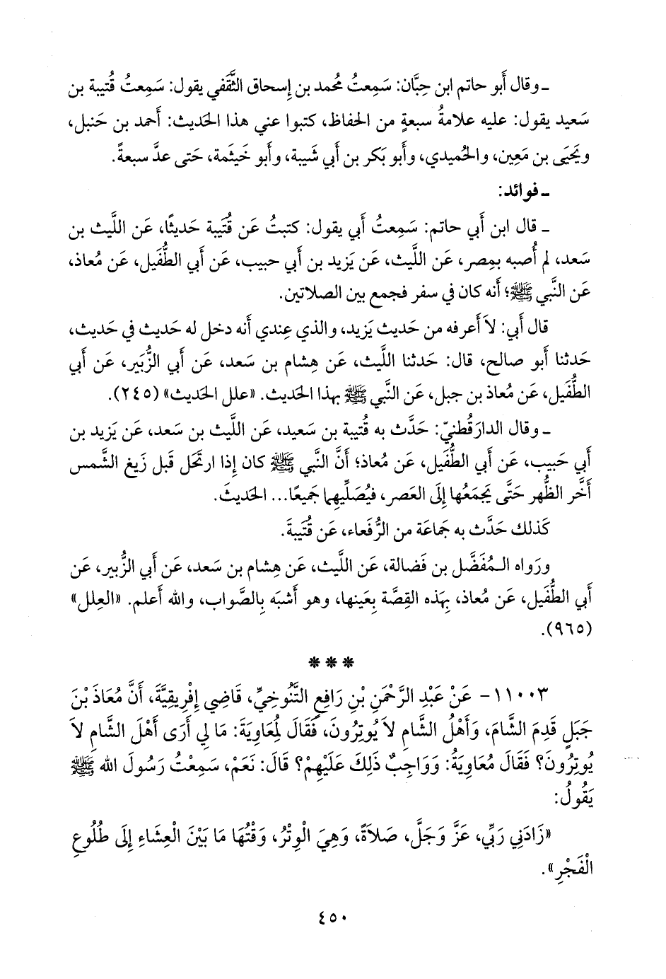 - قال عبد الرَّحمَن بن أبي حاتم الرازي: سمعت أبي يقول: كتبت عن قتيبة حديثا، عن الليث بن سعد، لم أصبه بمصر، عن الليث، عن يزيد بن أبي حبيب، عن أبي الطفيل، عن معاذ، عن النبي صَلى الله عَليه وسَلم؛ أنه كان في سفر فجمع بين الصلاتين.