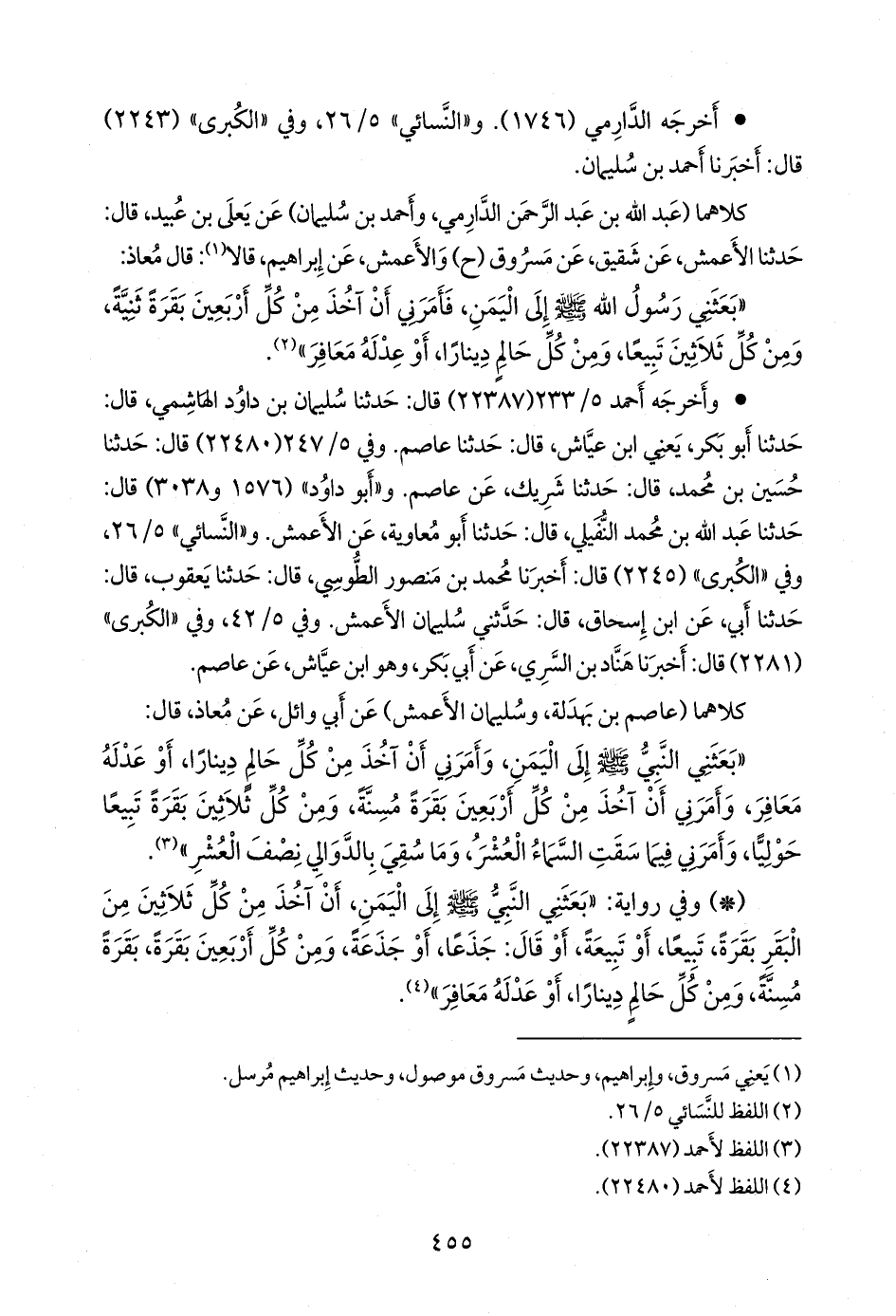 - وأخرجه أحمد (٢٢٣٨٧) قال: حدثنا سليمان بن داود الهاشمي، قال: حدثنا أَبو بكر، يعني ابن عياش، قال: حدثنا عاصم. وفي ٥/ ٢٤٧ (٢٢٤٨٠) قال: حدثنا حسين بن محمد، قال: حدثنا شَريك، عن عاصم. و «أَبو داود» (١٥٧٦ و ٣٠٣٨) قال: حدثنا عبد الله بن محمد النفيلي، قال: حدثنا أَبو معاوية، عن الأعمش. و «النَّسَائي» ٥/ ٢٦، وفي «الكبرى» (٢٢٤٥) قال: أخبرنا محمد بن منصور الطوسي، قال: حدثنا يعقوب، قال: حدثنا أبي، عن ابن إسحاق، قال: حدثني سليمان الأعمش. وفي ٥/ ٤٢، وفي «الكبرى» (٢٢٨١) قال: أخبرنا هَنَّاد بن السَّري، عن أَبي بكر، وهو ابن عياش، عن عاصم.