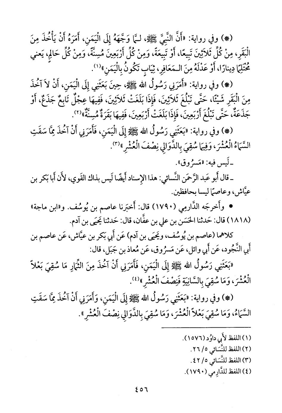 - وفي رواية: «بعثني رسول الله صَلى الله عَليه وسَلم إلى اليمن، وأمرني أن آخذ مما سقت السماء، وما سقي بعلا العشر، وما سقي بالدوالي نصف العشر».