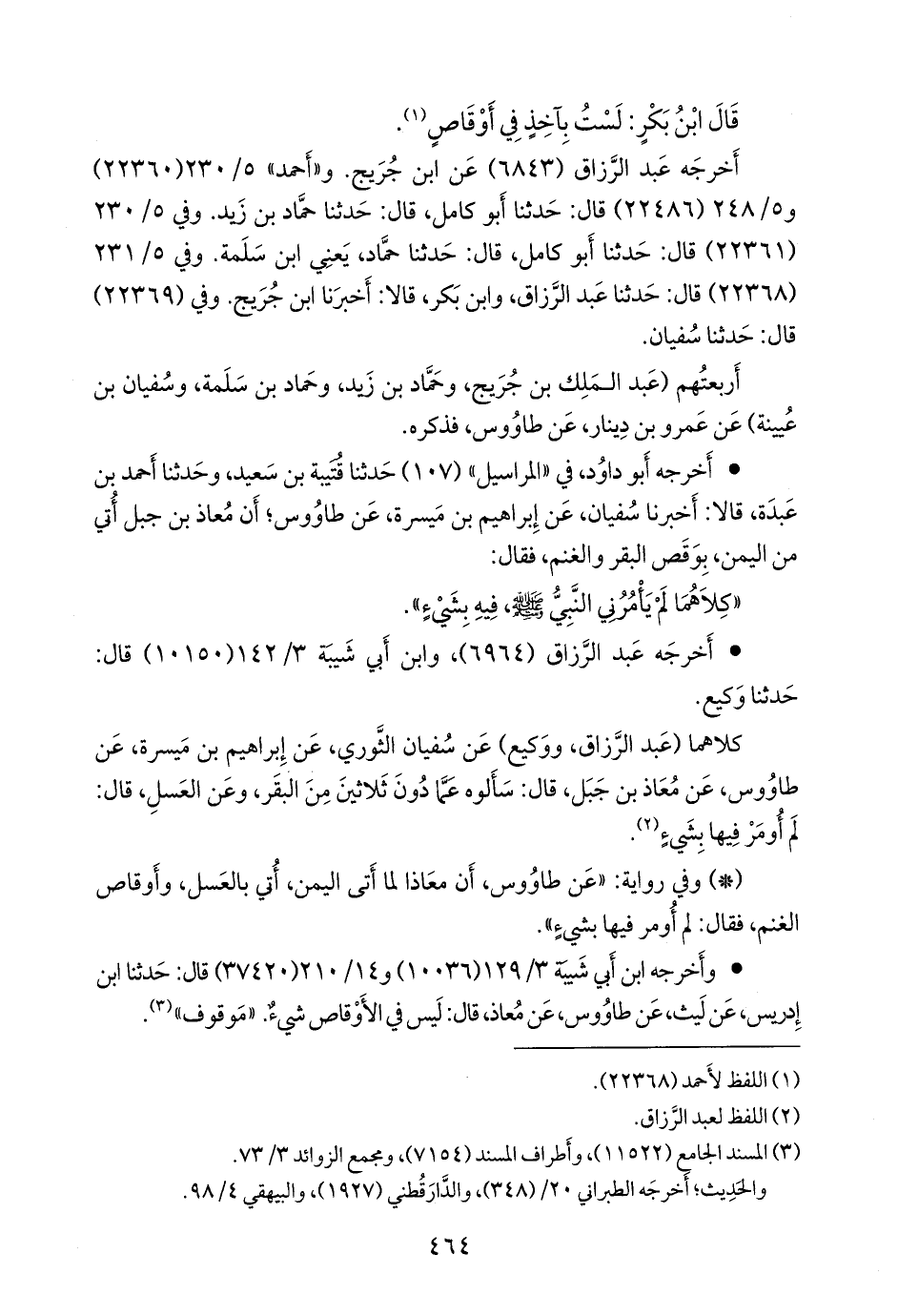 • وأخرجه ابن أبي شيبة (١٠٠٣٦) و ١٤/ ٢١٠ (٣٧٤٢٠) قال: حدثنا ابن إدريس، عن ليث، عن طاووس، عن معاذ، قال: ليس في الأوقاص شيء. «موقوف» (¬٢).