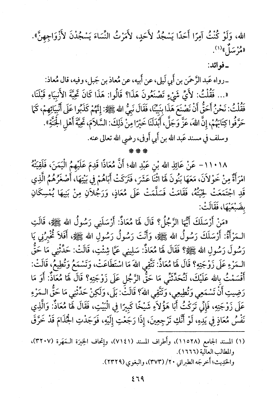 «من أرسلك أيها الرجل؟ قال لها معاذ: أرسلني رسول الله صَلى الله عَليه وسَلم قالت المرأة: أرسلك رسول الله صَلى الله عَليه وسَلم وأنت رسول رسول الله صَلى الله عَليه وسَلم أفلا تخبرني يا رسول رسول الله صَلى الله عَليه وسَلم؟ فقال لها معاذ: سليني عما شئت، قالت: حدثني ما حق المرء على زوجته؟ قال لها معاذ: تتقي الله ما استطاعت، وتسمع وتطيع، قالت: أقسمت بالله عليك، لتحدثني ما حق الرجل على زوجته؟ قال لها معاذ: أو ما رضيت أن تسمعي وتطيعي، وتتقي الله؟ قالت: بلى، ولكن حدثني ما حق المرء على زوجته، فإني تركت أبا هؤلاء شيخا كبيرا في البيت، فقال لها معاذ: والذي نفس معاذ في يده، لو أنك ترجعين، إذا رجعت إليه، فوجدت الجذام قد خرق