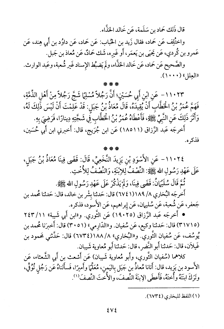 ١١٠٢٤ - عن الأسود بن يزيد النَّخَعي، قال: قضى فينا معاذ بن جبل، على عهد رسول الله صَلى الله عَليه وسَلم: النصف للابنة، والنصف للأخت.