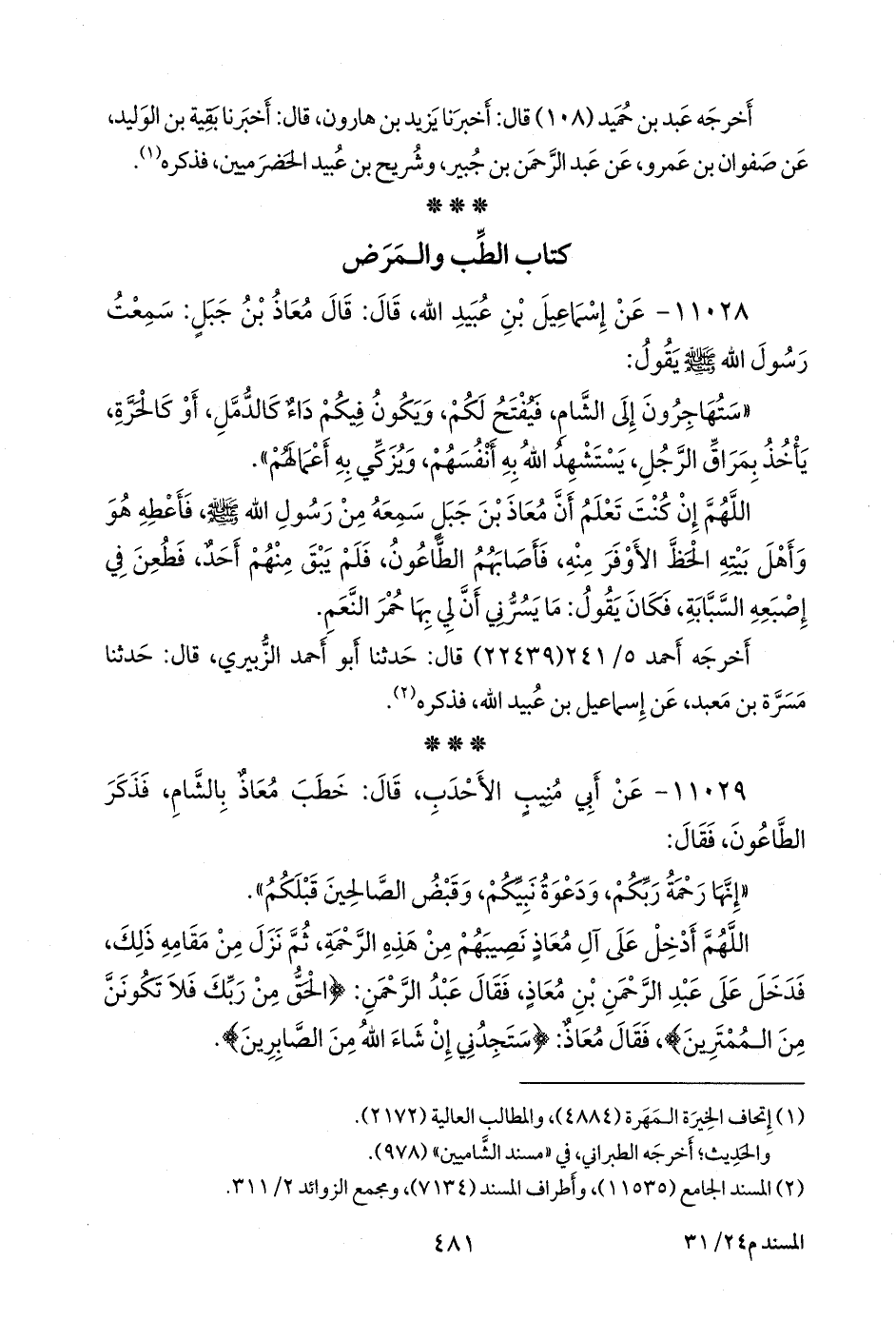 ١١٠٣٠ - عن أبي منيب الأحدب، قال: خطب معاذ بالشام، فذكر الطاعون، فقال: