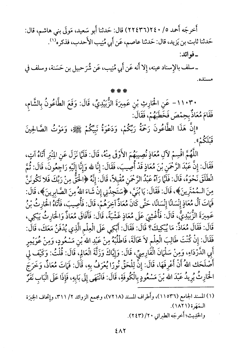 ١١٠٣١ - عن الحارث بن عميرة الزبيدي، قال: وقع الطاعون بالشام، فقام معاذ بحمص فخطبهم، فقال: