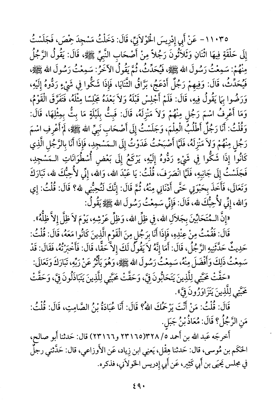١١٠٣٥ - عن أبي إدريس الخَولاني، قال: دخلت مسجد حمص، فجلست إلى حلقة فيها اثنان وثلاثون رجلا من أصحاب النبي صَلى الله عَليه وسَلم قال: يقول الرجل منهم: سمعت رسول الله صَلى الله عَليه وسَلم فيحدث، ثم يقول الآخر: سمعت رسول الله صَلى الله عَليه وسَلم فيحدث، قال: وفيهم رجل أدعج، براق الثنايا، فإذا شكوا في شيء ردوه إليه، ورضوا بما يقول فيه، قال: فلم أجلس قبله ولا بعده مجلسا مثله، فتفرق القوم، وما أعرف اسم رجل منهم ولا منزله، قال: فبت بليلة ما بت بمثلها، قال: وقلت: أنا رجل أطلب العلم، وجلست إلى أصحاب نبي الله صَلى الله عَليه وسَلم لم أعرف اسم رجل منهم ولا منزله، فلما أصبحت غدوت إلى المسجد، فإذا أنا بالرجل الذي كانوا إذا شكوا في شيء ردوه إليه، يركع إلى بعض أسطوانات المسجد، فجلست إلى جانبه، فلما انصرف، قلت: يا عبد الله، والله، إني لأحبك لله، تبارك وتعالى، فأخذ بحبوتي حتى أدناني منه، ثم قال: إنك لتحبني لله؟ قال: قلت: إي والله، إني لأحبك لله، قال: فإني سمعت رسول الله صَلى الله عَليه وسَلم يقول: