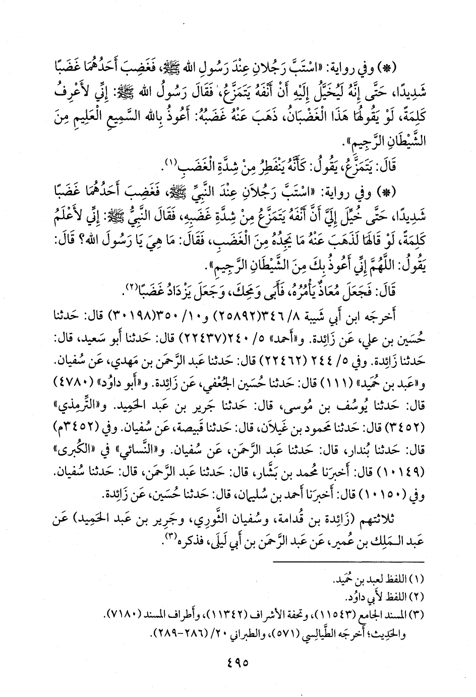 و «أَبو داود» (٤٧٨٠) قال: حدثنا يوسف بن موسى، قال: حدثنا جَرير بن عبد الحميد. و «التِّرمِذي» (٣٤٥٢) قال: حدثنا محمود بن غَيلان، قال: حدثنا قَبيصَة، عن سفيان. وفي (٣٤٥٢ م) قال: حدثنا بُندَار، قال: حدثنا عبد الرَّحمَن، عن سفيان. و «النَّسَائي» في «الكبرى» (١٠١٤٩) قال: أخبرنا محمد بن بشار، قال: حدثنا عبد الرَّحمَن، قال: حدثنا سفيان. وفي (١٠١٥٠) قال: أخبرنا أحمد بن سليمان، قال: حدثنا حسين، عن زائدة.