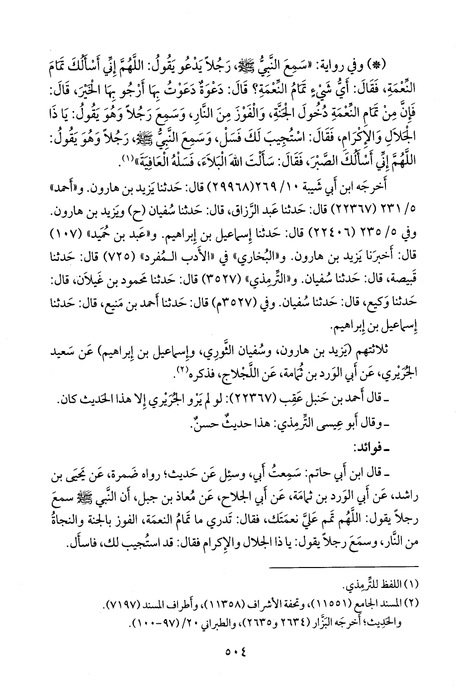 - قال ابن أَبي حاتم: سمعتُ أَبي، وسئل عن حديثٍ؛ رواه ضَمرة، عن يَحيى بن راشد، عن أَبي الورد بن ثمامَة، عن أَبي الجُلاح، عن معاذ بن جبل، أَن النبي صَلى الله عَليه وسَلم سمع رجلًا يقول: اللهم تَمم عليَّ نِعمتَك، فقال: تَدري ما تَمامُ النعمة، الفوز بالجنة والنجاة من النار، وسَمِع رجلًا يقول: يا ذا الجلال والإِكرام، فقال: قد استُجيب لك، فاسأل.