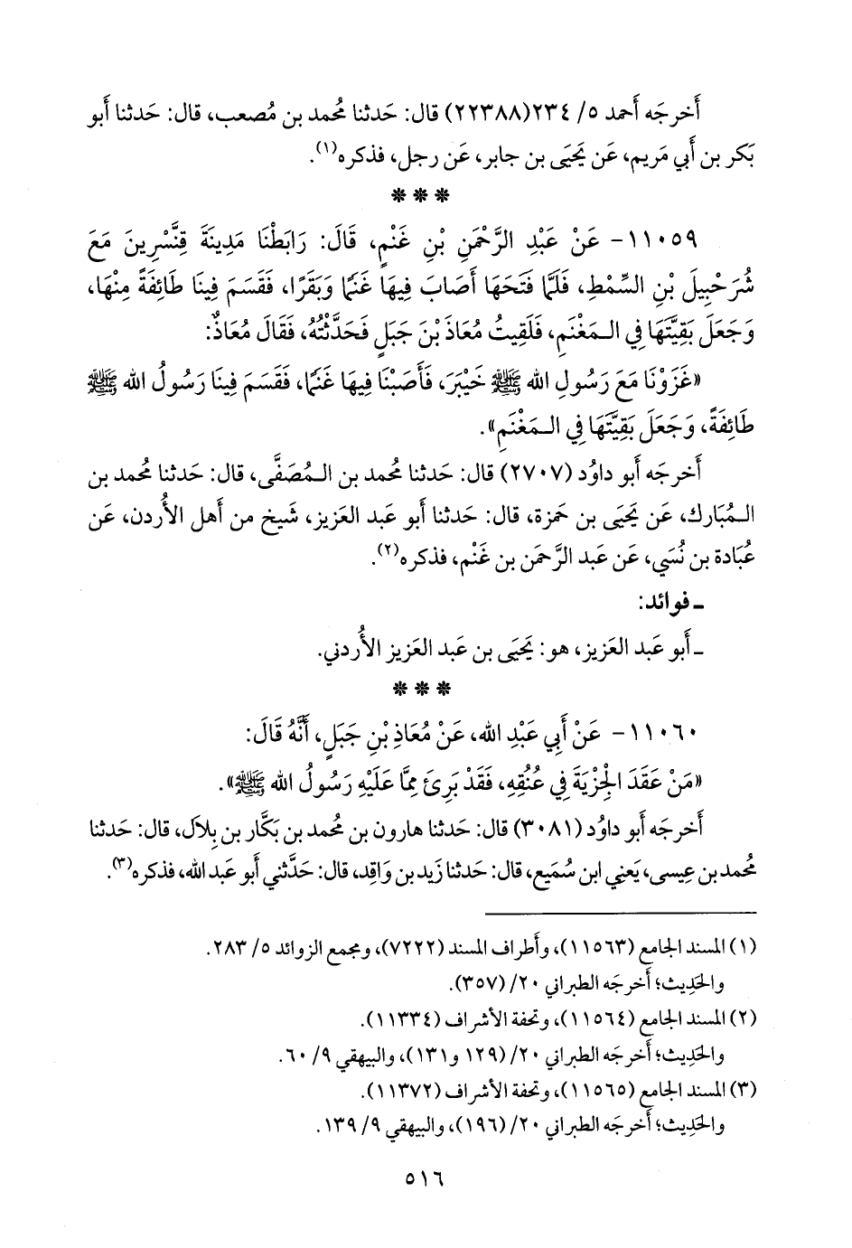 ١١٠٥٩ - عن عبد الرَّحمَن بن غَنْم، قال: رابطنا مدينة قنسرين مع شُرحبيل بن السِّمْط، فلما فتحها أصاب فيها غنما وبقرا، فقسم فينا طائفة منها، وجعل بقيتها في المغنم، فلقيت معاذ بن جبل فحدثته، فقال معاذ: