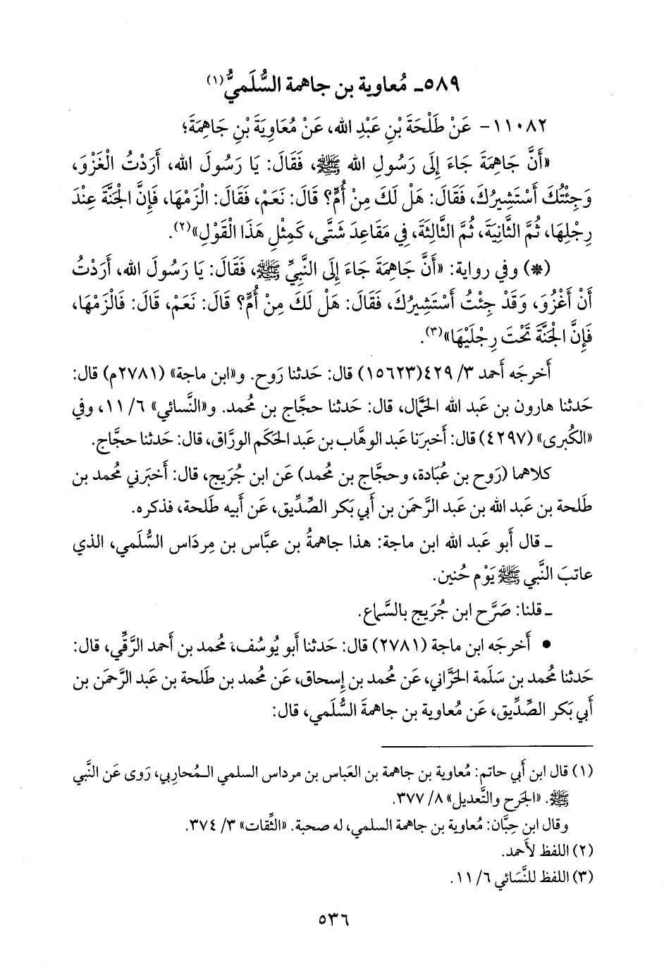 • أخرجه ابن ماجة (٢٧٨١) قال: حدثنا أَبو يوسف، محمد بن أحمد الرَّقِّي، قال: حدثنا محمد بن سلمة الحراني، عن محمد بن إسحاق، عن محمد بن طلحة بن عبد الرَّحمَن بن أَبي بكر الصِّدِّيق، عن معاوية بن جاهمة السلمي، قال: