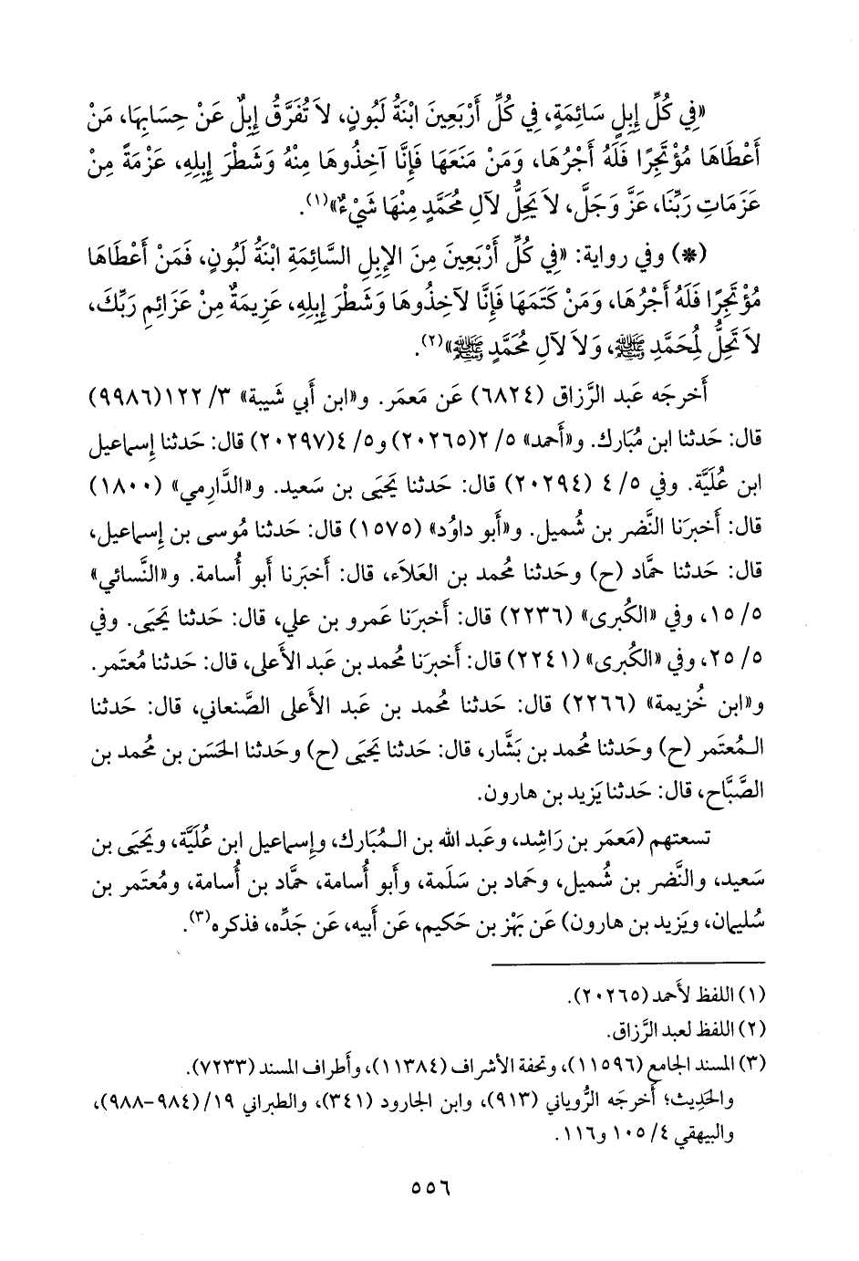 تسعتهم (مَعمَر بن راشد، وعبد الله بن المبارك، وإسماعيل ابن عُلَية، ويحيى بن سعيد، والنضر بن شميل، وحماد بن سلمة، وأَبو أُسامة حماد بن أُسامة، ومعتمر بن سليمان، ويزيد بن هارون) عن بَهز بن حكيم بن معاوية، عن أبيه، فذكره (¬١).