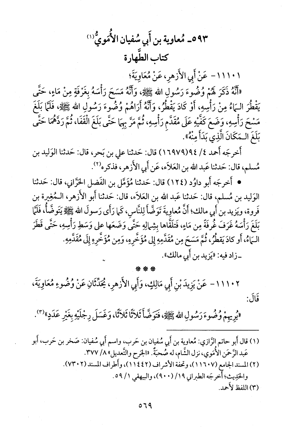 • أَخرجه أَبو داود (١٢٤) قال: حدثنا مُؤَمَّل بن الفضل الحراني، قال: حدثنا الوليد بن مسلم، قال: حدثنا عبد الله بن العلاء، قال: حدثنا أَبو الأزهر، المغيرة بن فروة، ويزيد بن أبي مالك؛ أن معاوية توضأ للناس، كما رأى رسول الله صَلى الله عَليه وسَلم يتوضأ، فلما بلغ رأسه غرف غرفة من ماء، فتلقاها بشماله حتى وضعها على وسط رأسه، حتى قطر الماء، أو كاد يقطر، ثم مسح من مقدمه إلى مؤخره، ومن مؤخره إلى مقدمه.