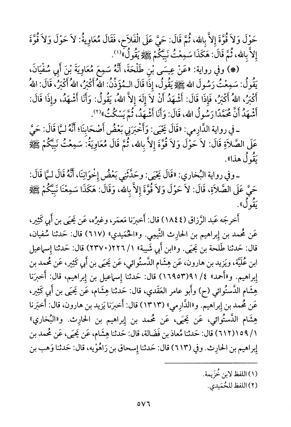- في رواية الدَّارِمي: «قال يحيى: وأخبرني بعض أصحابنا؛ أنه لما قال: حي على الصلاة قال: لا حول ولا قوة إلا بالله، ثم قال معاوية: سمعت نبيكم صَلى الله عَليه وسَلم يقول هذا».