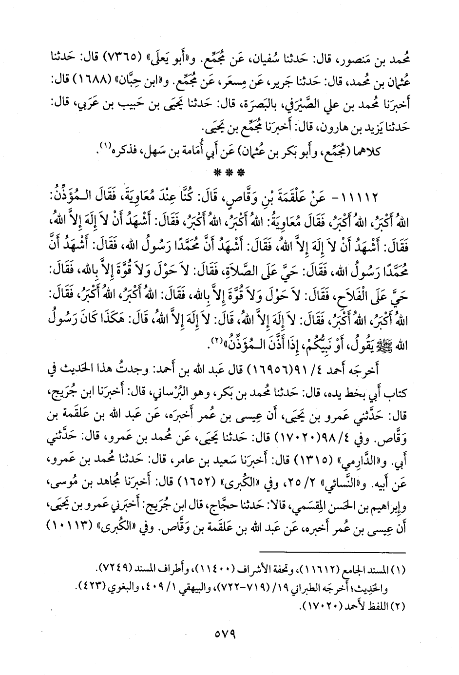 ١١١١٢ - عن علقمة بن وقاص، قال: كنا عند معاوية، فقال المؤذن: الله أكبر، الله أكبر، فقال معاوية: الله أكبر، الله أكبر، فقال: أشهد أن لا إله إلا الله، فقال: أشهد أن لا إله إلا الله، فقال: أشهد أن محمدا رسول الله، فقال: أشهد أن محمدا رسول الله، فقال: حي على الصلاة، فقال: لا حول ولا قوة إلا بالله، فقال: حي على الفلاح، فقال: لا حول ولا قوة إلا بالله، فقال: الله أكبر، الله أكبر، فقال: الله أكبر، الله أكبر، فقال: لا إله إلا الله، قال: لا إله إلا الله، قال: هكذا كان رسول الله صَلى الله عَليه وسَلم يقول، أو نبيكم، إذا أذن المؤذن» (¬١).