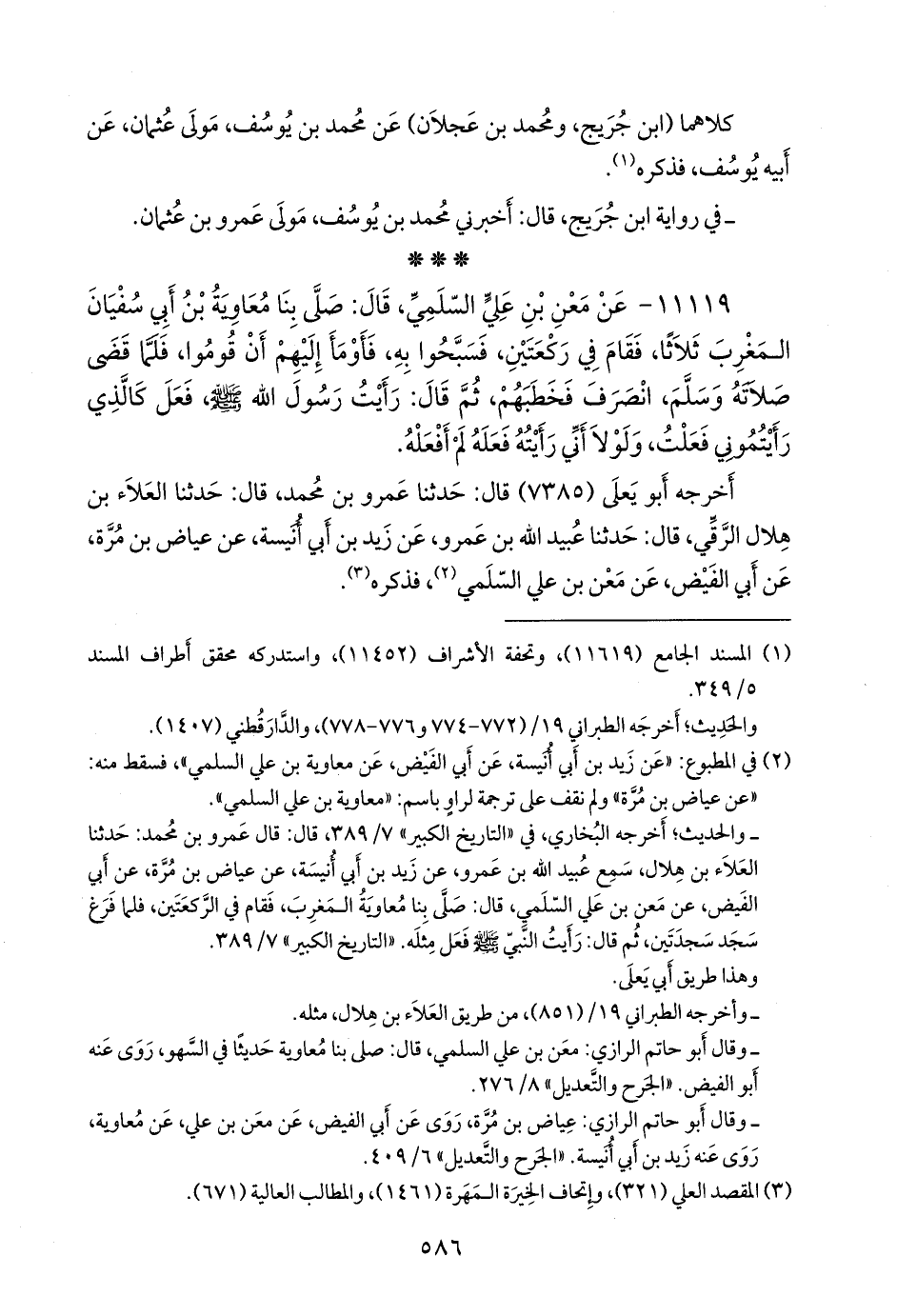 ١١١١٩ - عن معاوية بن علي السلمي، قال: صلى بنا معاوية بن أبي سفيان المغرب ثلاثا، فقام في ركعتين، فسبحوا به، فأومأ إليهم أن قوموا، فلما قضى صلاته وسلم، انصرف فخطبهم، ثم قال: رأيت رسول الله صَلى الله عَليه وسَلم فعل كالذي رأيتموني فعلت، ولولا أني رأيته فعله لم أفعله.