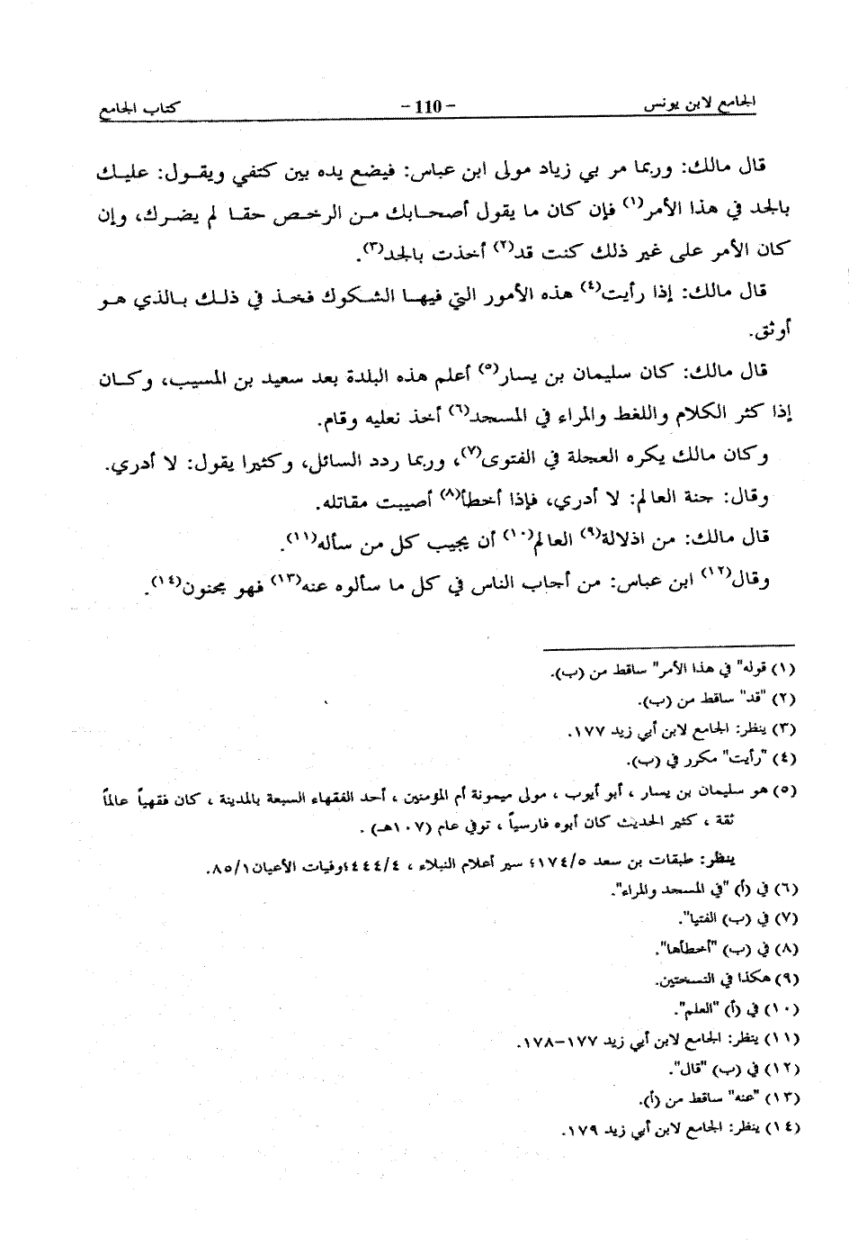 قال مالك: كان سليمان بن يسار أعلم هذه البلدة بعد سعيد بن المسيب، وكان إذا كثر الكلام واللغظ والمراء في المسجد أخذ نعليه وقام.