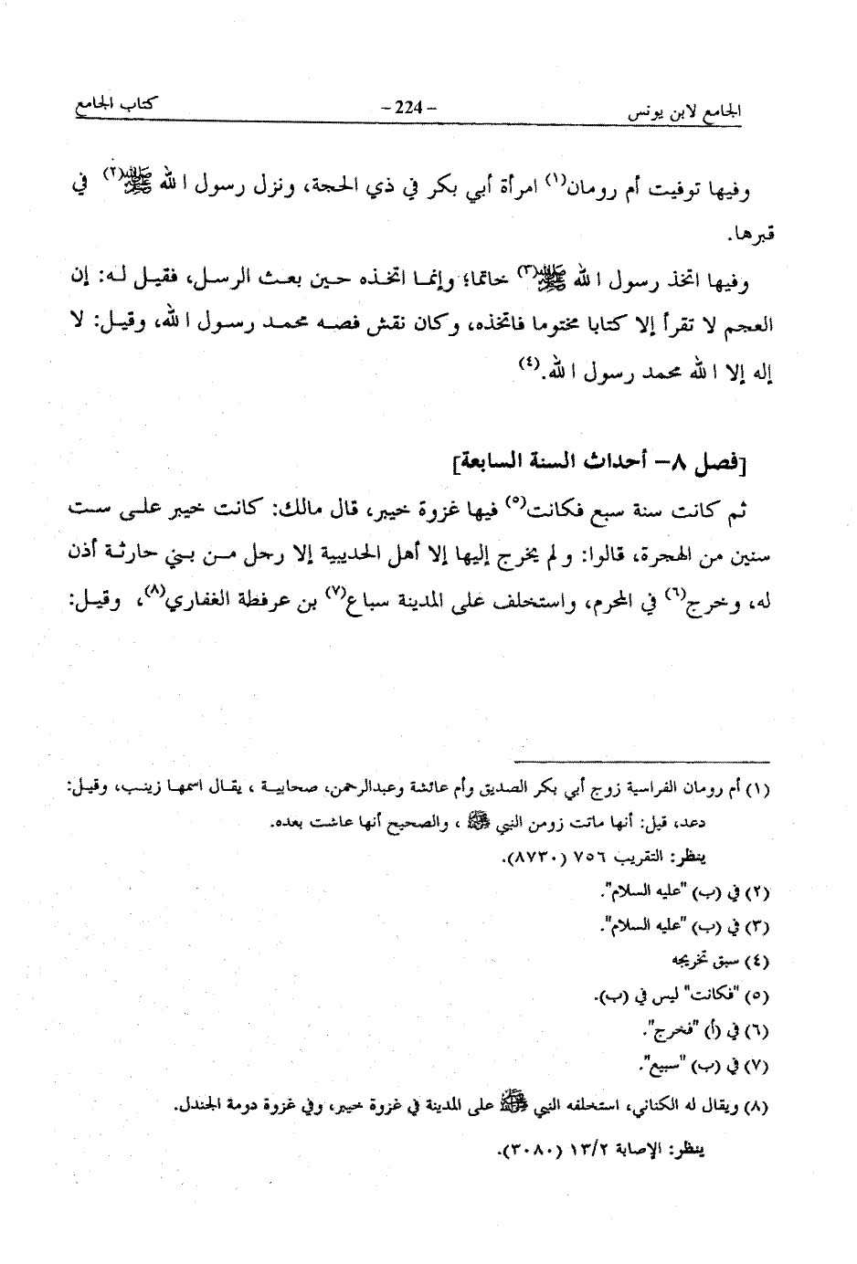 ثم كانت سنة سبع فكانت فيها غزوة خيبر، قال مالك: كانت خيبر على ست سنين من الهجرة، قالوا: ولم يخرج إليها إلا أهل الحديبية إلا رجل من بني حارثة أذن له، وخرج في المحرم، واستخلف على المدينة سباع بن عرفطة الغفاري، وقيل: