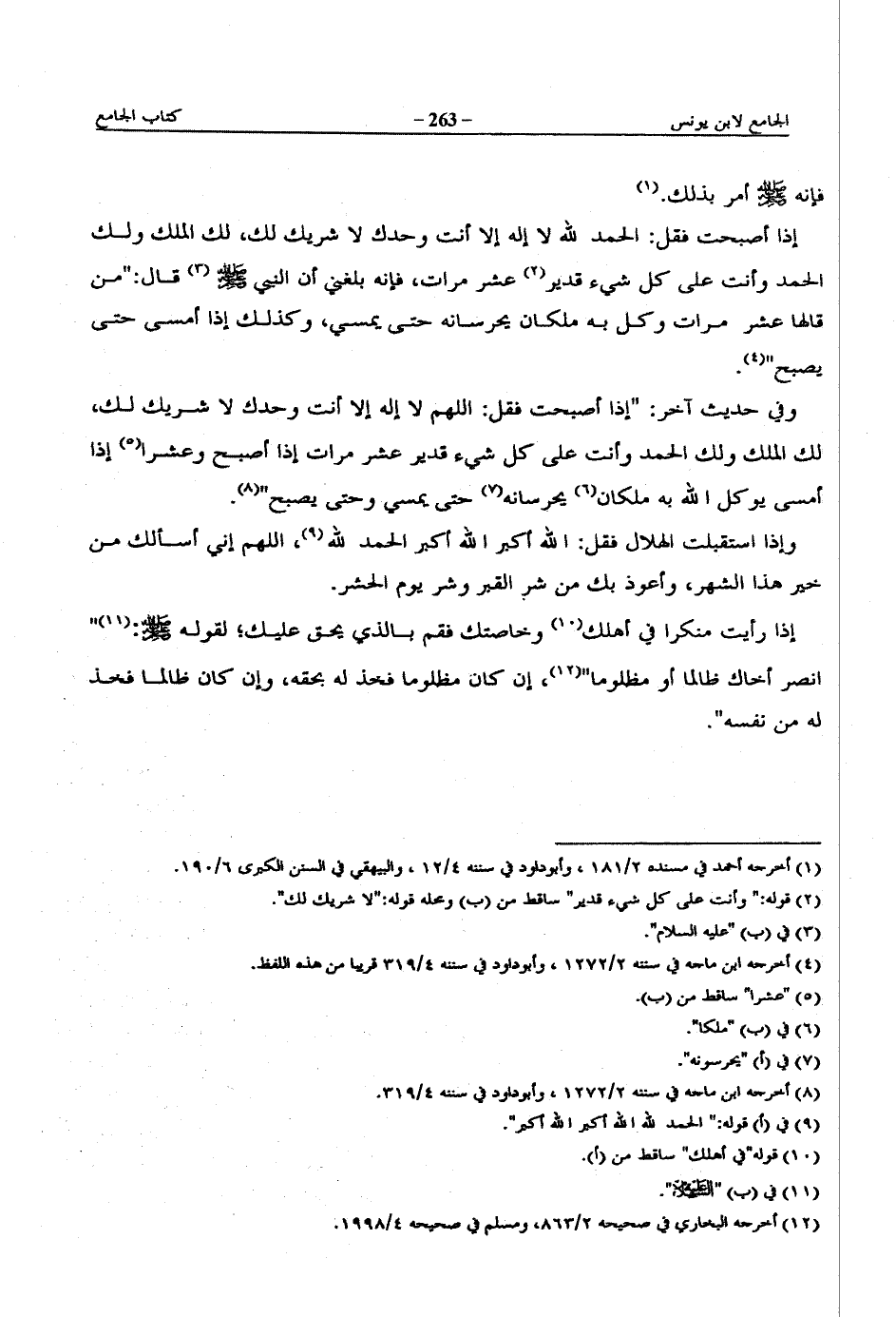 وفي حديث آخر: "إذا أصبحت فقل: اللهم لا إله إلا أنت وحدك لا شريك لك، لك الملك ولك الحمد وأنت على كل شيء قدير عشر مرات إذا أصبح وعشرا إذا أمسى يوكل الله به ملكان يحرسانه حتى يمسي وحتى يصبح".