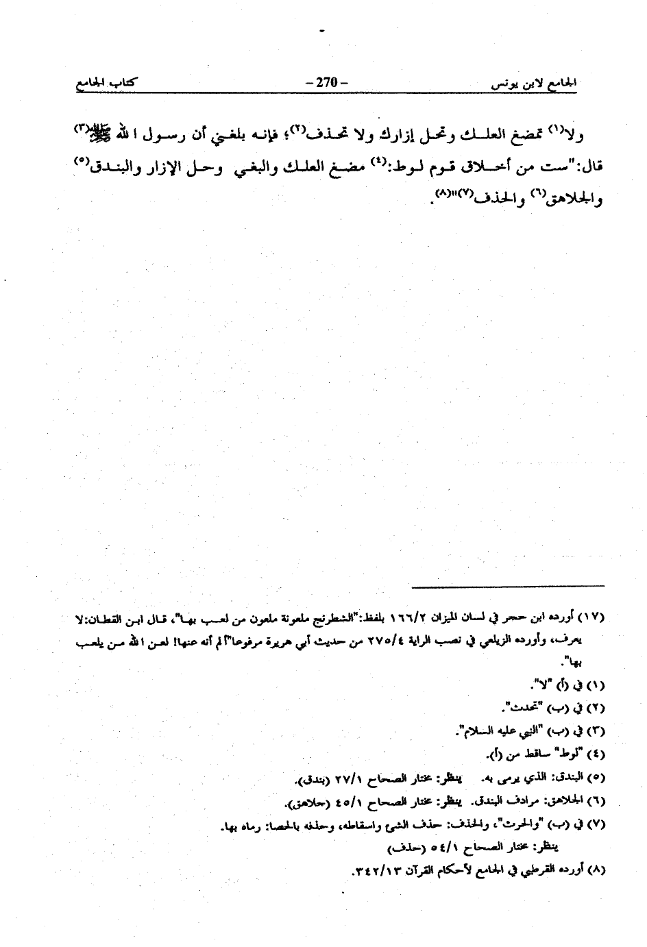 ولا تمضغ العلك وتحل إزارك ولا تحذف؛ فإنه بلغني أن رسول الله صلى الله عليه وسلم قال: "ست من أخلاق قوم لوط: مضغ العلك والبغي وحل الإزار والبندق والجلاهق والحذف".