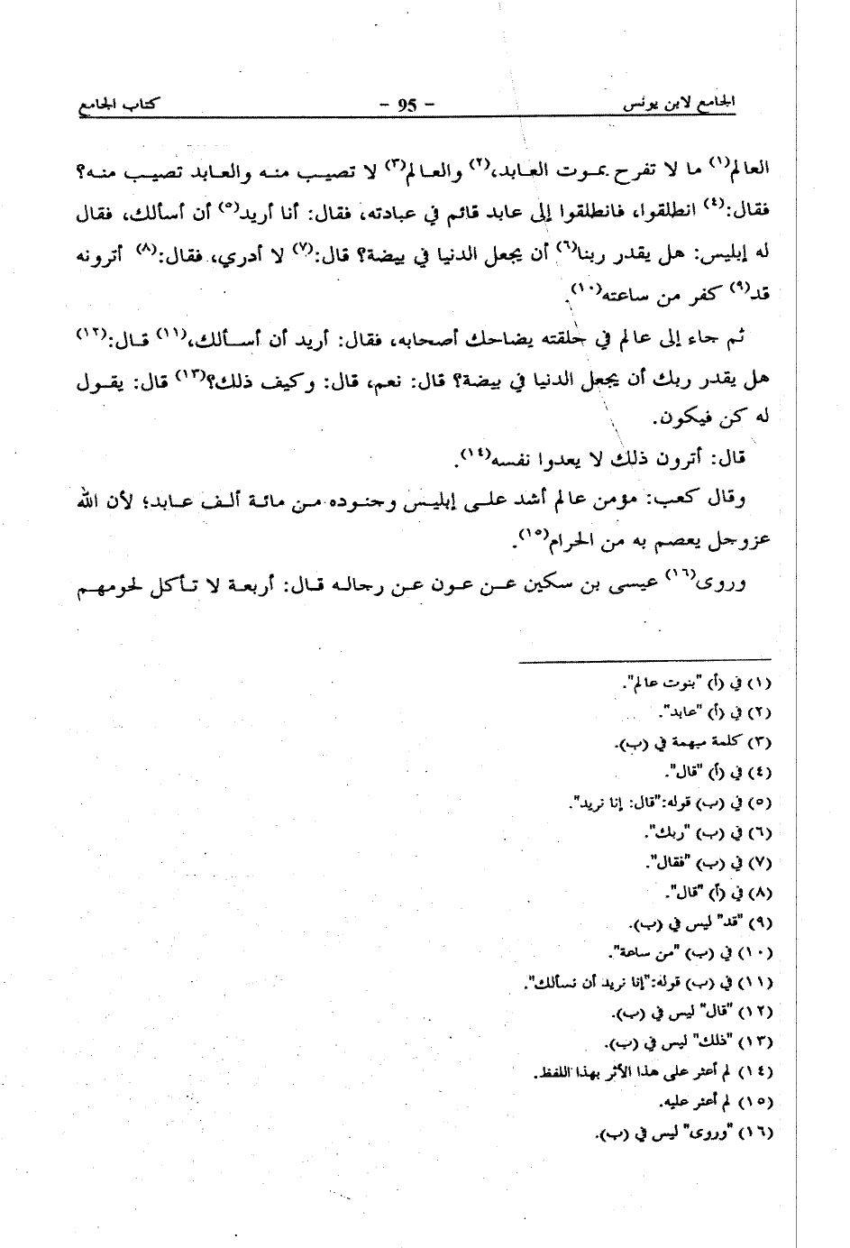 فقال: انطلقوا، فانطلقوا إلى عابد قائم في عبادته، فقال: أنا أريد أن أسألك، فقال له إبليس: هل يقدر ربنا أن يجعل الدنيا في بيضة؟ قال: لا أدري، فقال: أترونه قد كفر من ساعته.