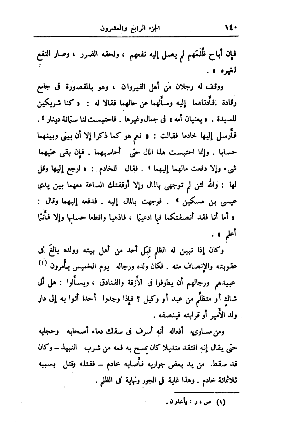 ووقف له رجلان من أهل القيروان، وهو بالمقصورة فى جامع رقادة. فأدناهما إليه وسألهما عن حالهما فقالا له: «كنا شريكين للسيدة. «يعنيان أمه» فى جمال وغيرها. فاحتبست لنا ستمائة دينار» .