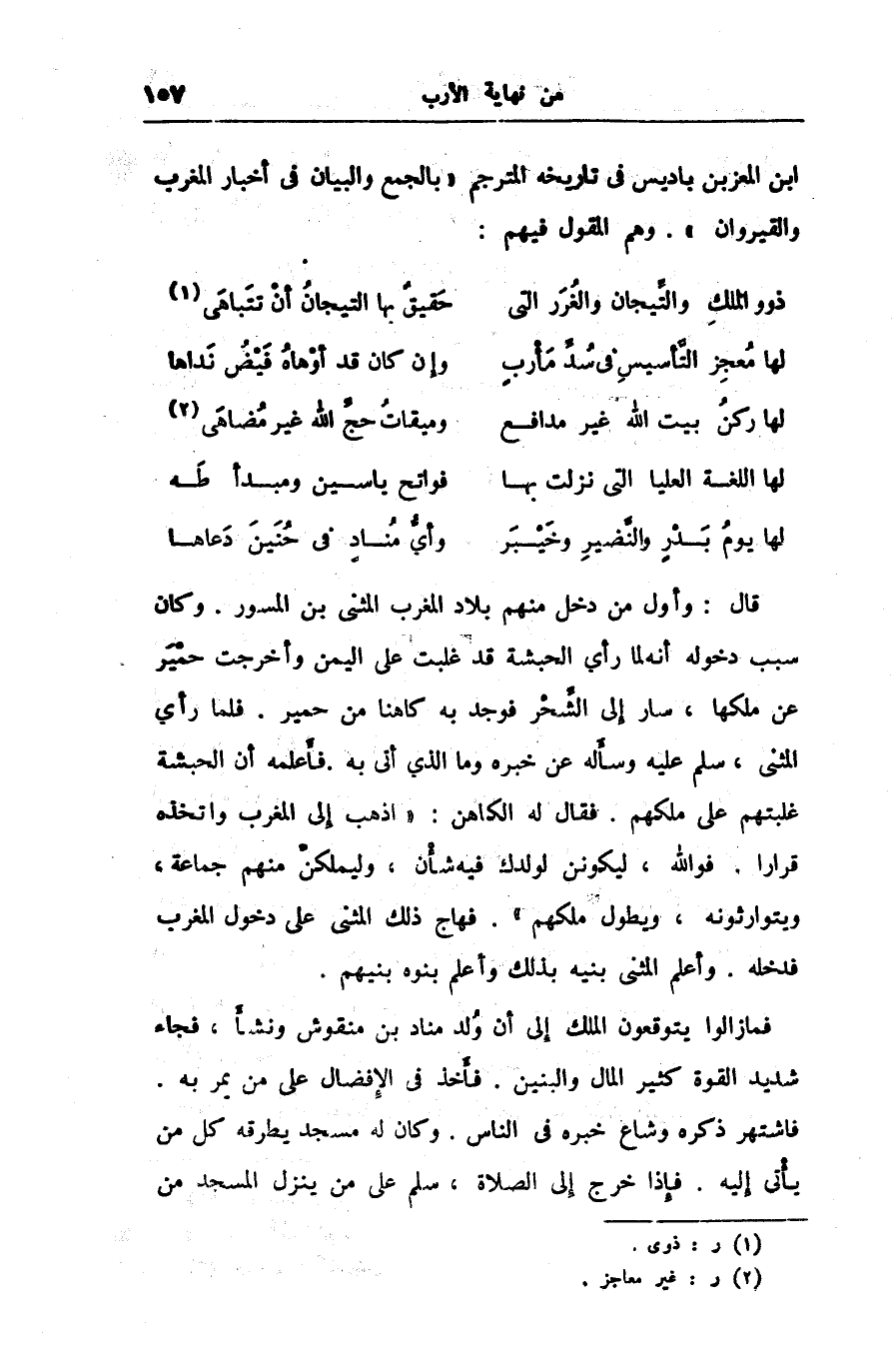 قال: وأول من دخل منهم بلاد المغرب المثنى بن المسور. وكان سبب دخوله أنه لما رأى الحبشة قد غلبت على اليمن وأخرجت حمير عن ملكها، سار إلى الشّحر فوجد به كاهنا من حمير. فلما رأي المثنى، سلم عليه وسأله عن خبره وما الذى أتى به. فأعلمه أن الحبشة غلبتهم على ملكهم. فقال له الكاهن: «اذهب إلى المغرب واتخذه قرارا. فو الله، ليكونن لولدك فيه شأن، وليملكنّ منهم جماعة، ويتوارثونه، ويطول ملكهم» . فهاج ذلك المثنى على دخول المغرب فدخله. وأعلم المثنى بنيه بذلك وأعلم بنوه بنيهم.