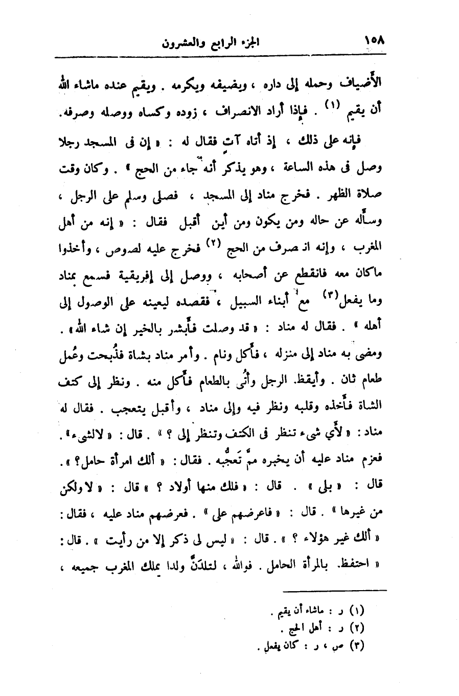 فإنه على ذلك، إذ أتاه آت فقال له: «إن فى المسجد رجلا وصل فى هذه الساعة، وهو يذكر أنه جاء من الحج» . وكان وقت صلاة الظهر. فخرج مناد إلى المسجد، فصلى وسلم على الرجل، وسأله عن حاله ومن يكون ومن أين أقبل فقال: «إنه من أهل المغرب، وإنه انصرف من الحج «2» فخرج عليه لصوص، وأخذوا ما كان معه فانقطع عن أصحابه، ووصل إلى إفريقية فسمع بمناد وما يفعل «3» مع أبناء السبيل، فقصده ليعينه على الوصول إلى أهله» . فقال له مناد: «قد وصلت فأبشر بالخير إن شاء الله» .