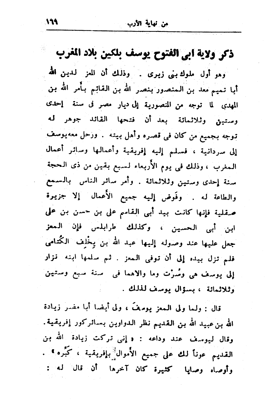 قال: ولما ولى المعز يوسف، ولى أيضا أبا مضر زيادة الله بن عبيد الله بن القديم نظر الدواوين بسائر كور إفريقية.