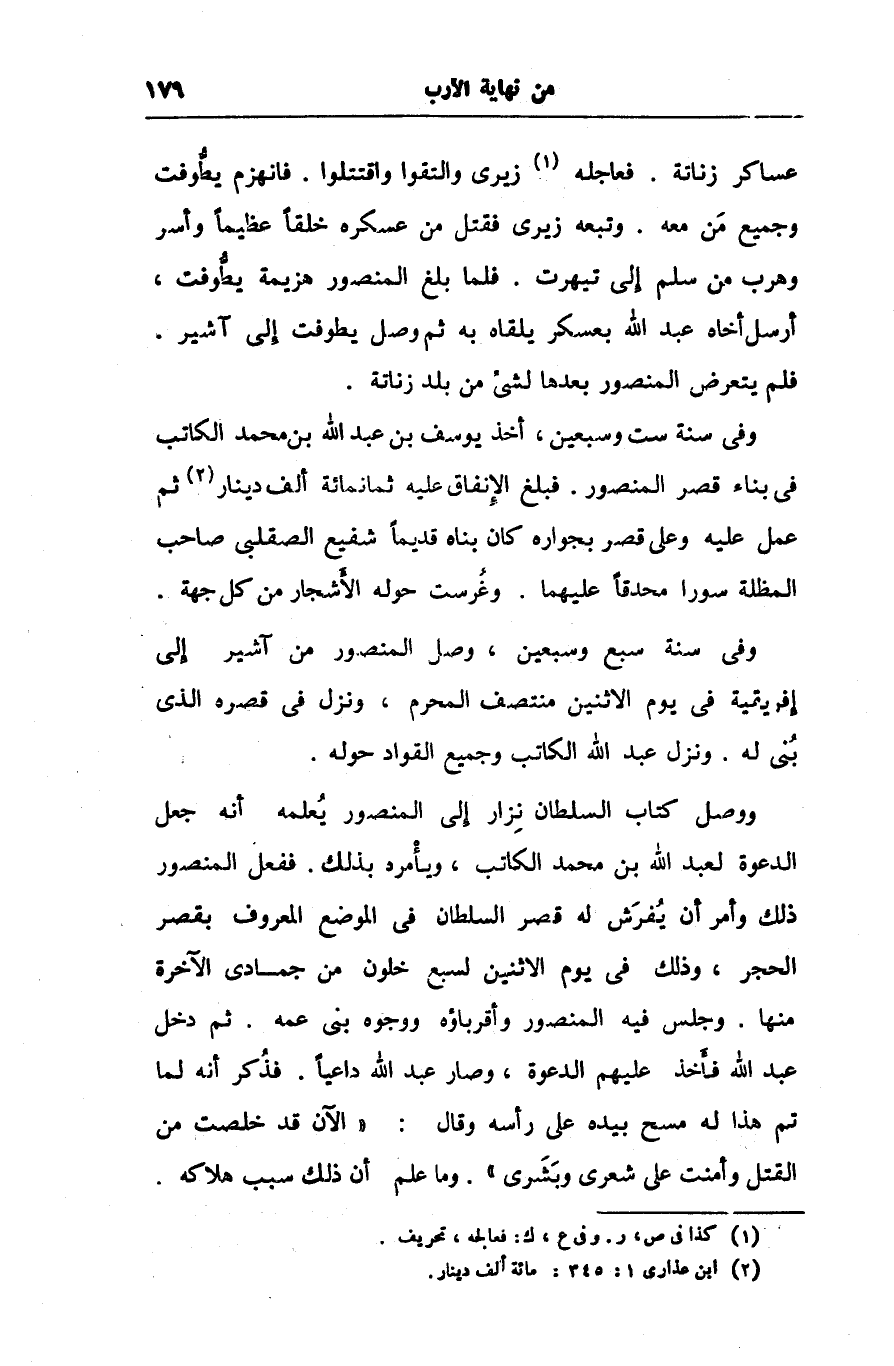 وفى سنة سبع وسبعين، وصل المنصور من آشير إلى إفريقية فى يوم الاثنين منتصف المحرم، ونزل فى قصره الذى بنى له. ونزل عبد الله الكاتب وجميع القواد حوله.