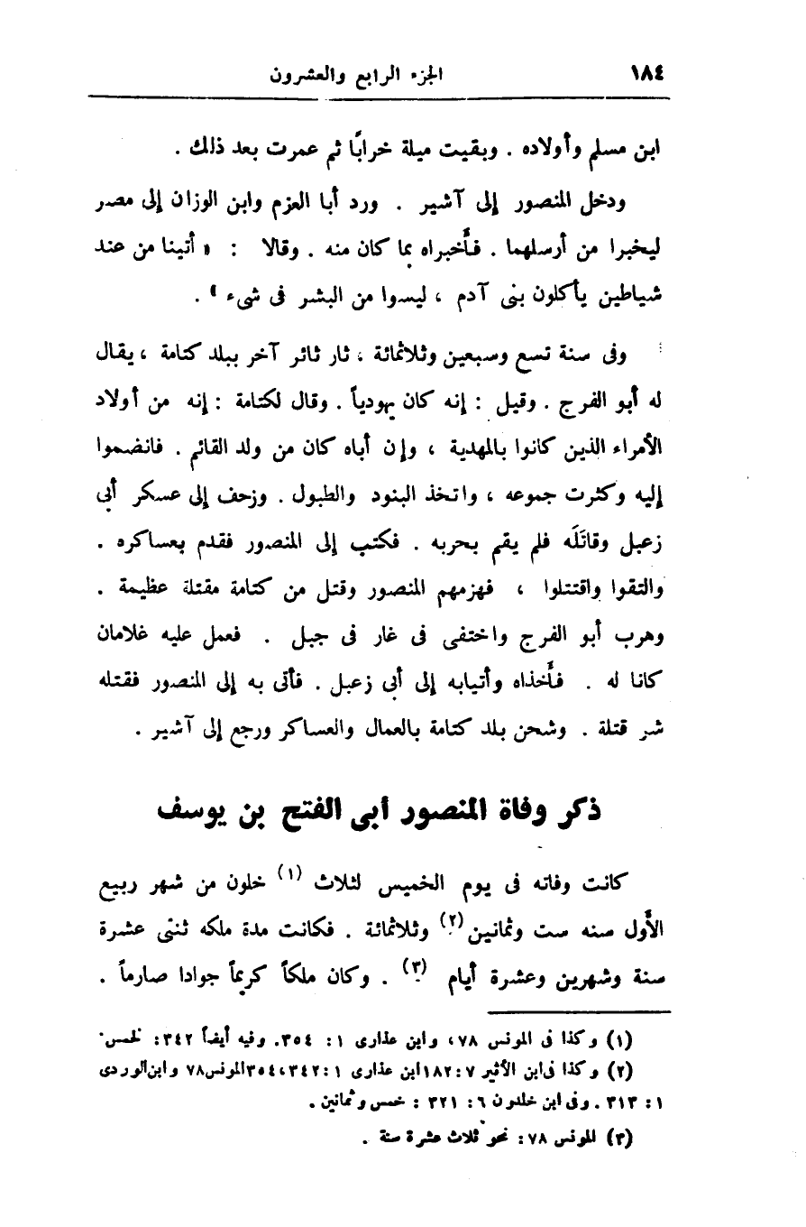 ودخل المنصور إلى آشير. ورد أبا العزم وابن الوزان إلى مصر ليخبرا من أرسلهما. فأخبراه بما كان منه. وقالا: «أتينا من عند شياطين يأكلون بنى آدم، ليسوا من البشر فى شىء» .