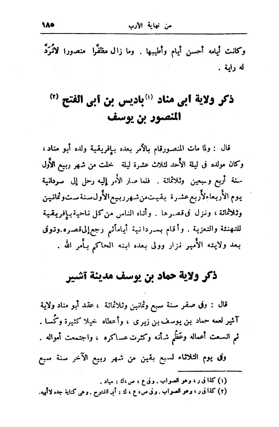 قال: وفى صفر سنة سبع وثمانين وثلاثمائة، عقد أبو مناد ولاية آشير لعمه حماد بن يوسف بن زيرى، وأعطاه خيلا كثيرة وكسا.