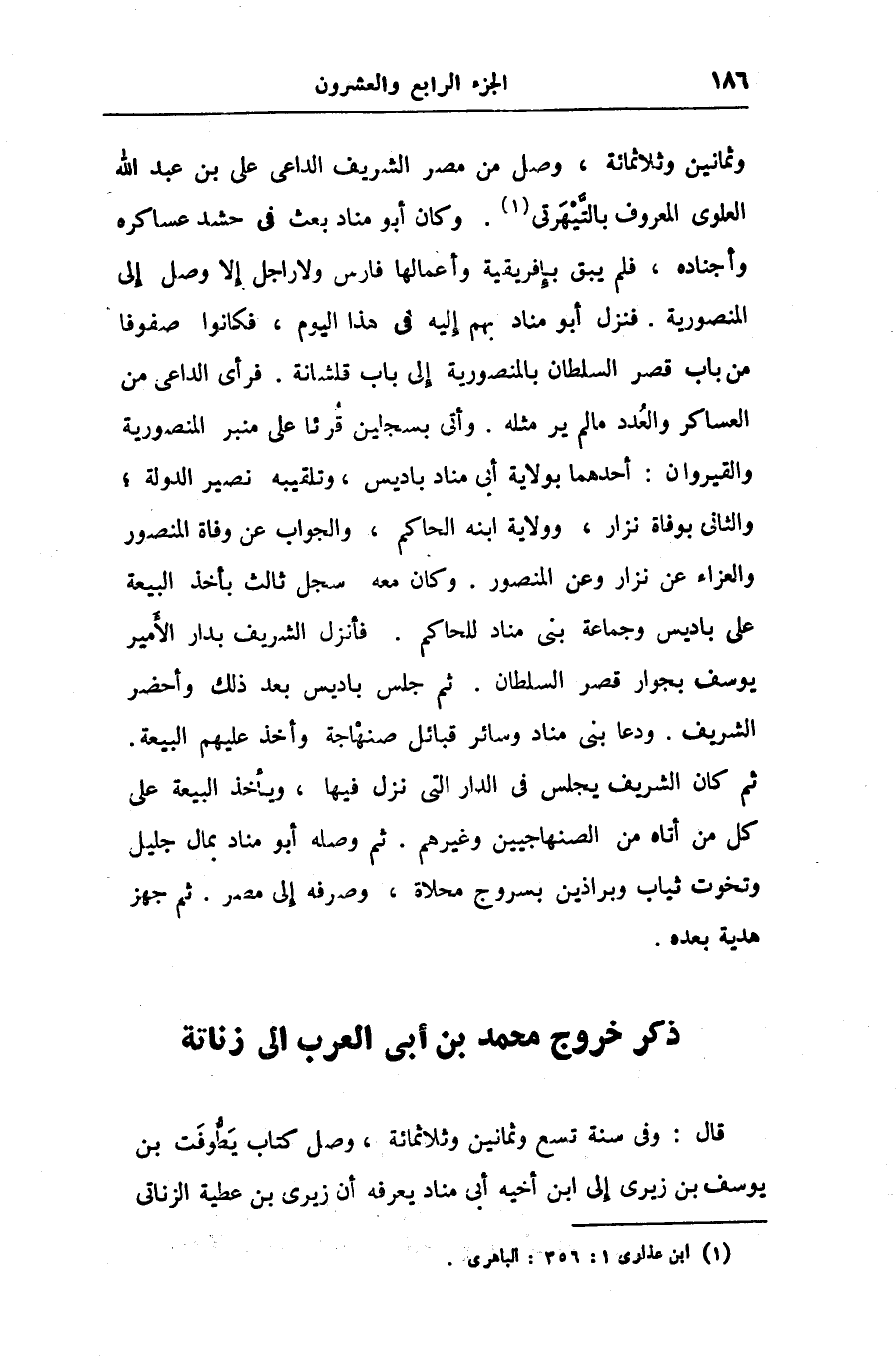 وثمانين وثلاثمائة، وصل من مصر الشريف الداعى على بن عبد الله العلوى المعروف بالتّيهرتى «1» . وكان أبو مناد بعث فى حشد عساكره وأجناده، فلم يبق بإفريقية وأعمالها فارس ولا راجل إلا وصل إلى المنصورية. فنزل أبو مناد بهم إليه فى هذا اليوم، فكانوا صفوفا من باب قصر السلطان بالمنصورية إلى باب قلشانة. فرأى الداعى من العساكر والعدد ما لم ير مثله. وأتى بسجلين قرئا على منبر المنصورية والقيروان: أحدهما بولاية أبى مناد باديس، وتلقيبه نصير الدولة؛ والثانى بوفاة نزار، وولاية ابنه الحاكم، والجواب عن وفاة المنصور والعزاء عن نزار وعن المنصور. وكان معه سجل ثالث بأخذ البيعة على باديس وجماعة بنى مناد للحاكم. فأنزل الشريف بدار الأمير يوسف بجوار قصر السلطان. ثم جلس باديس بعد ذلك وأحضر الشريف. ودعا بنى مناد وسائر قبائل صنهاجة وأخذ عليهم البيعة.