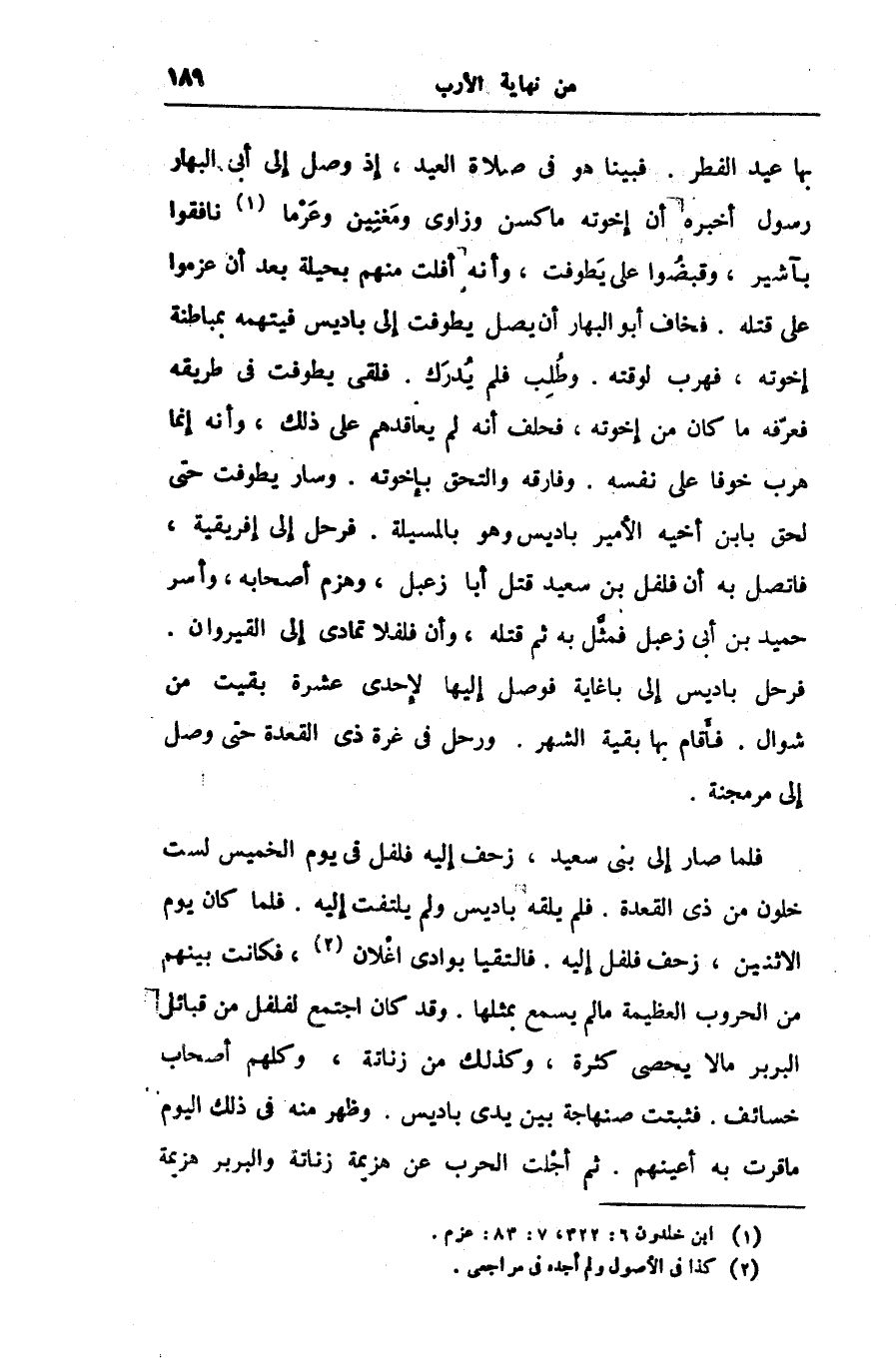 فلما صار إلى بنى سعيد، زحف إليه فلفل فى يوم الخميس لست خلون من ذى القعدة. فلم يلقه باديس ولم يلتفت إليه. فلما كان يوم الاثنين، زحف فلفل إليه. فالتقيا بوادى اغلان «2» ، فكانت بينهم من الحروب العظيمة ما لم يسمع بمثلها. وقد كان اجتمع لفلفل من قبائل البربر ما لا يحصى كثرة، وكذلك من زناتة، وكلهم أصحاب خسائف. فثبتت صنهاجة بين يدى باديس. وظهر منه فى ذلك اليوم ما قرت به أعينهم. ثم أجلت الحرب عن هزيمة زناتة والبربر هزيمة