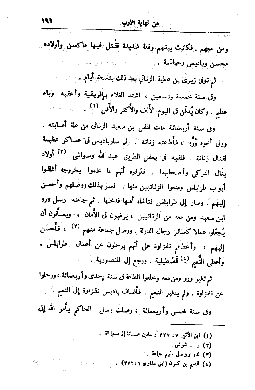 وولى أخوه ورّو، فأطاعته زنانة. ثم سار باديس فى عساكر عظيمة لقتال زناتة. فلقيه فى بعض الطريق عبد الله وسواشى «2» أولاد ينال التركى وأصحابهما. فعرفوه أنهم لما علموا بخروجه أغلقوا أبواب طرابلس ومنعوا الزناتيين منها. فسر بذلك ووصلهم وأحسن إليهم. وسار إلى طرابلس فتلقاه أهلها فدخلها. ثم جاءته رسل ورو ابن سعيد ومن معه من الزناتيين، يرغبون فى الأمان، ويسألون أن يجعلوا عمالا كسائر رجال الدولة. ووصل جماعة منهم «3» ، فأحسن إليهم، وأعطاهم نفزاوة على أنهم يرحلون عن أعمال طرابلس.