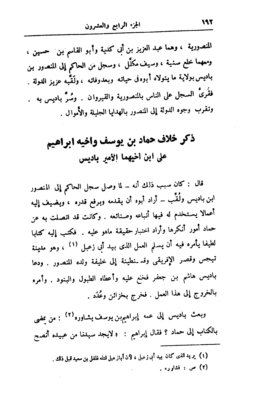 وبعث باديس إلى عمه إبراهيم بن يوسف يشاوره «2» : من يمضى بالكتاب إلى حماد؟ فقال إبراهيم: «لا يجد سيدنا من عبيده أنصح