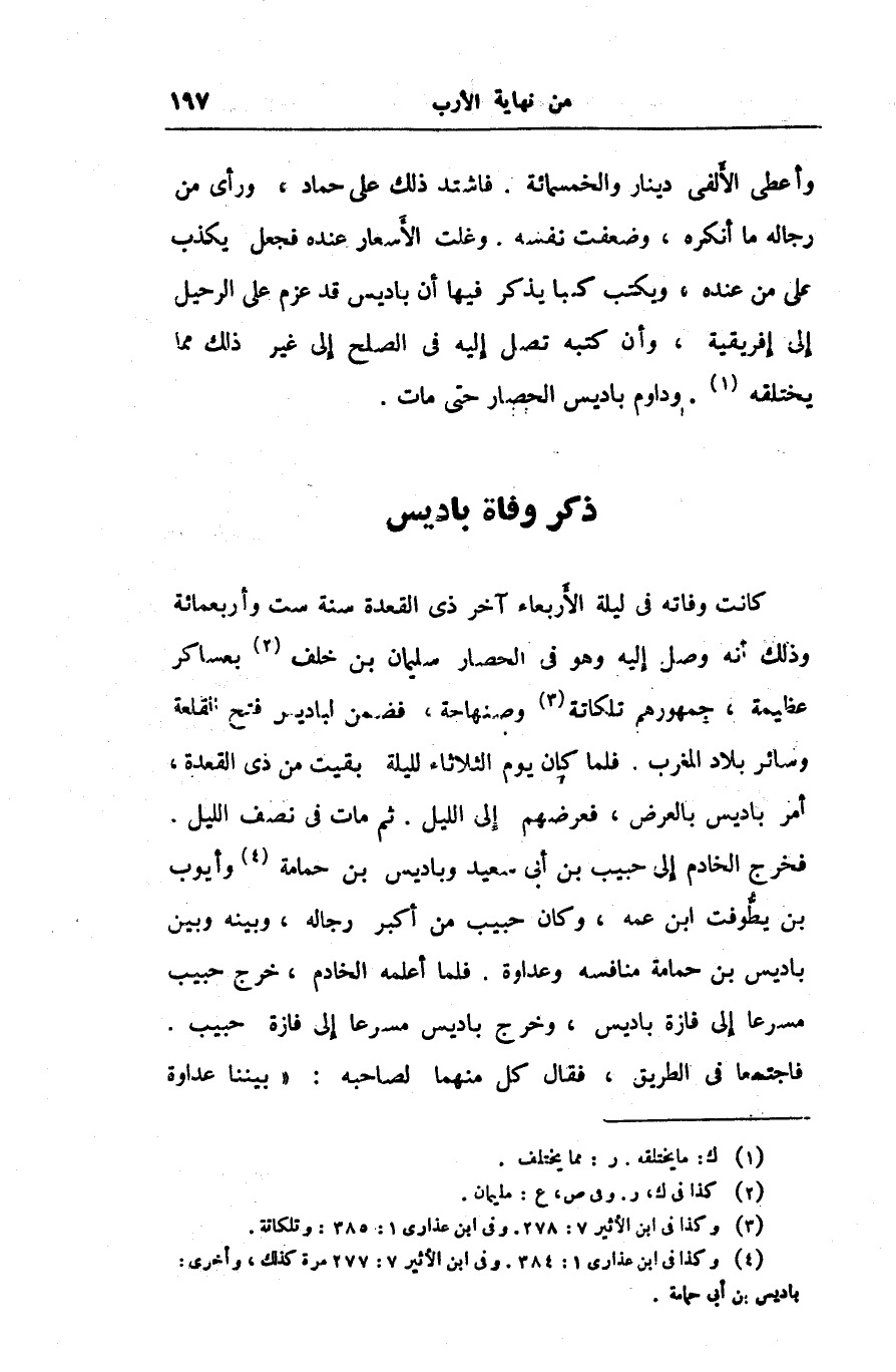 كانت وفاته فى ليلة الأربعاء آخر ذى القعدة سنة ست وأربعمائة وذلك أنه وصل إليه وهو فى الحصار سليمان بن خلف «2» بعساكر عظيمة، جمهورهم تلكاتة «3» وصنهاجة، فضمن لبادير فتح للقلعة وسائر بلاد المغرب. فلما كان يوم الثلاثاء لليلة بقيت من ذى القعدة، أمر باديس بالعرض، فعرضهم إلى الليل. ثم مات فى نصف الليل.